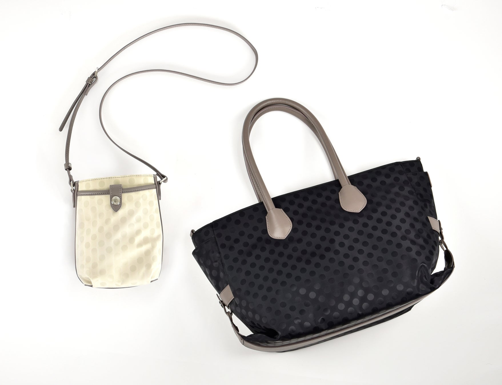 1~2泊の旅行にも使えそうなたっぷりトートは角度によって浮き出るようなドット柄がおしゃれ。