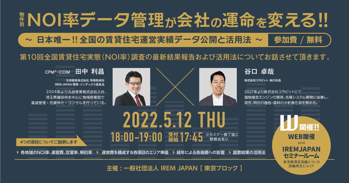CCIM Institute(米国認定不動産投資顧問協会)日本支部の一般社団法人CCIM JAPANは、著名な不動産投資家である石渡 浩氏と、M&Aや事業承継の専門家であるNBC税理士法人の鈴木 公男氏による不動産投資家・地主様むけセミナーを2022年7月21日(木)に無料セミナーを開催いたします。