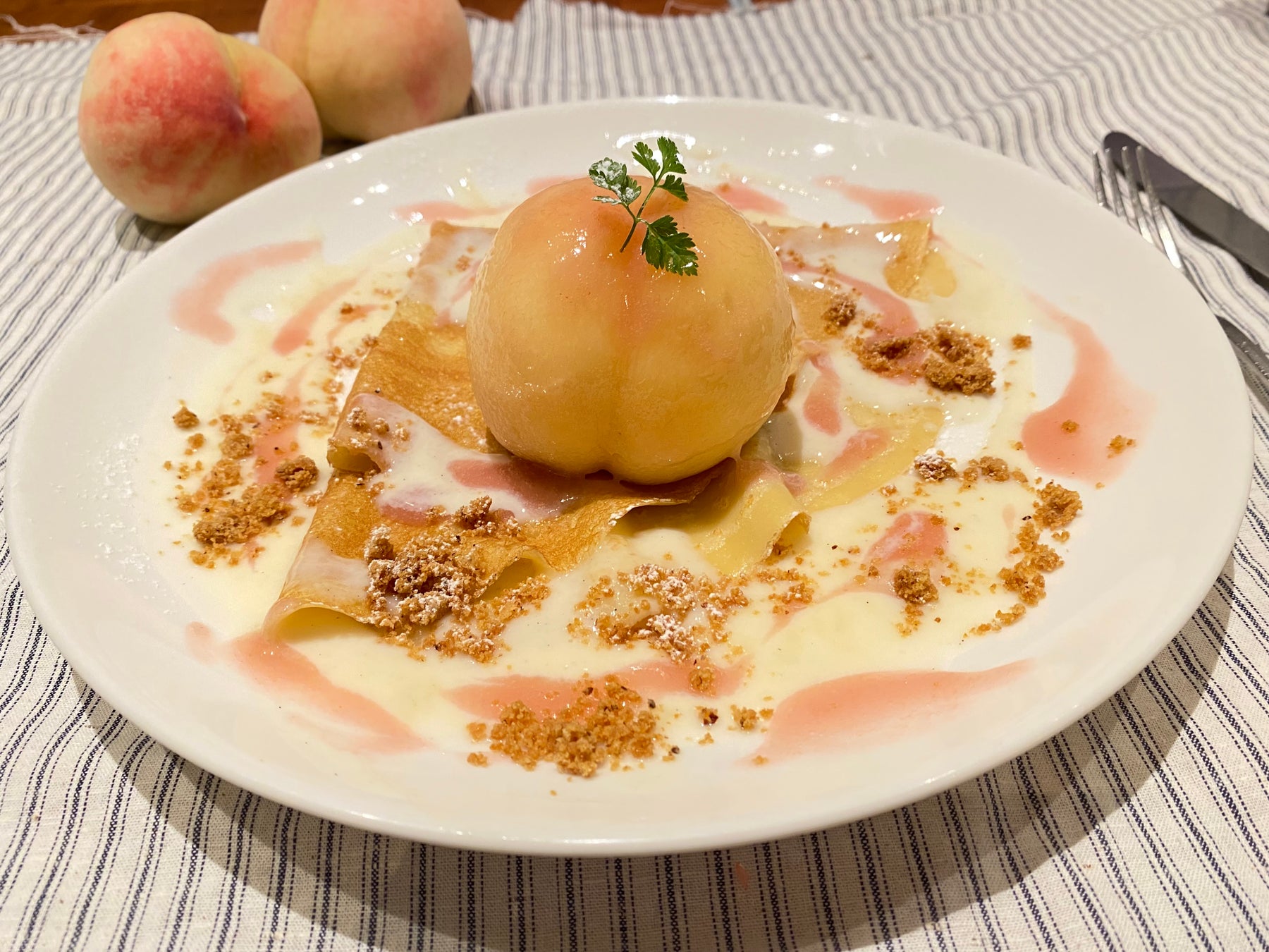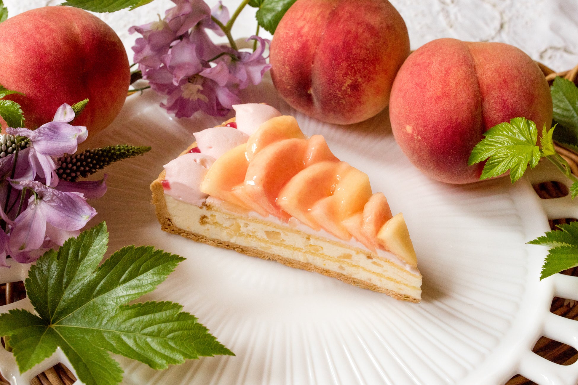 岸和田市の包近町で栽培された包近の桃は糖度が高く、甘みが非常に強いのが特徴。桃の美味しさを引き立てるように爽やかなヨーグルトムースと桃クリームを合わせました。