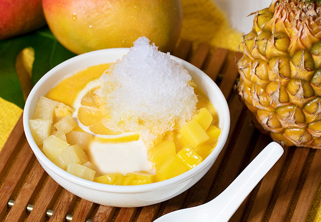 台湾名物のヘルシースイーツ「豆花」が主役のかき氷。つるっとした独特の食感の豆花にかき氷とマンゴー、パイナップルをトッピング。ソースはマンゴーの果肉やジャスミンティー、レモンで爽やかに仕上げ、暑い夏でもすっきりとお召し上がりいただけます。