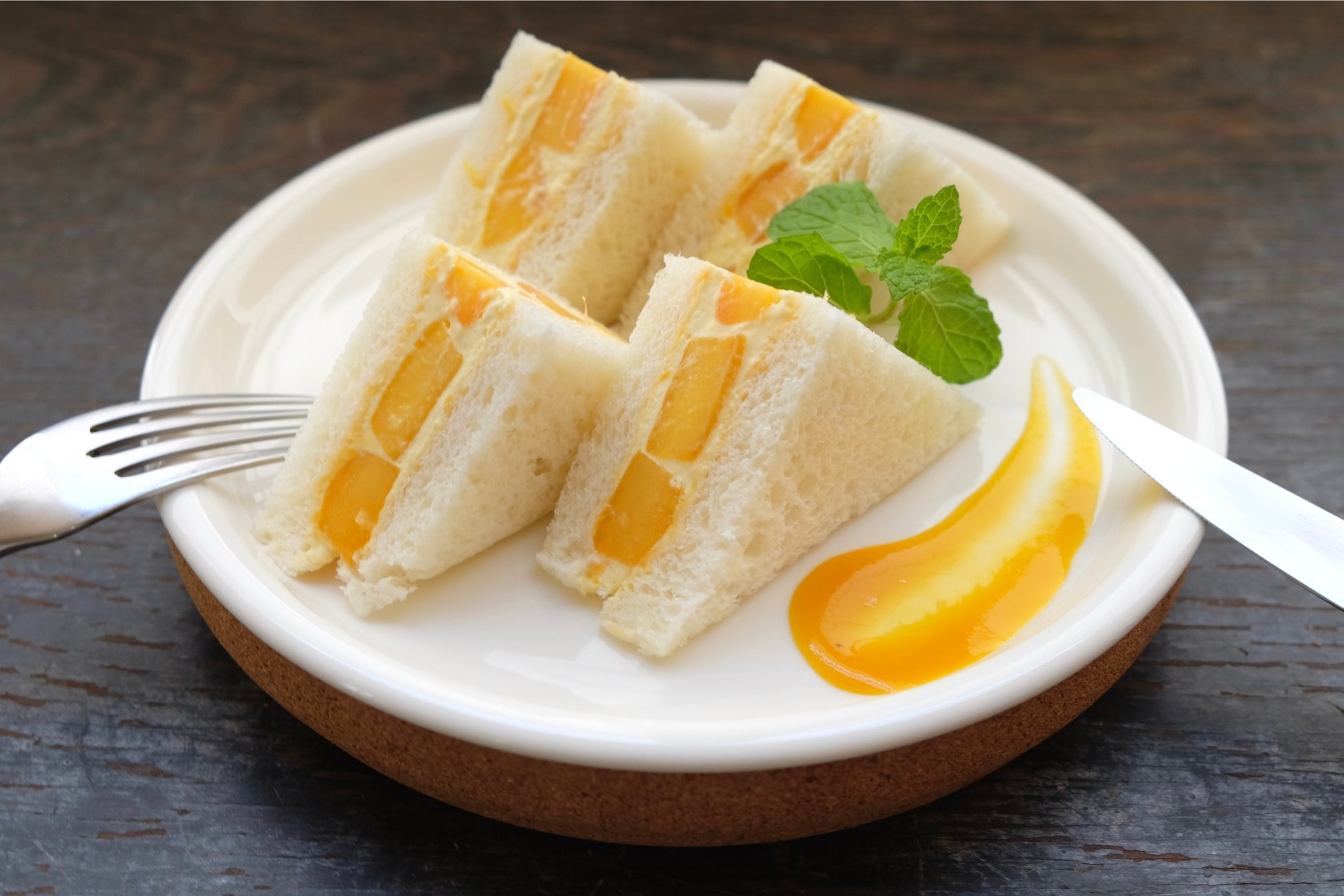 完熟マンゴーをふんだんに使ったマンゴーサンドです。生クリームにマスカルポーネを合わせ、マンゴーの果肉を練り込んだオリジナルのホイップクリームは、サンドに使用しているレブレッソブレッドと相性抜群です。