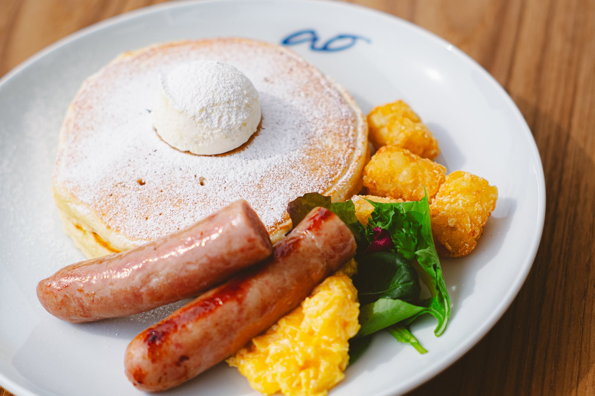 バターミルクパンケーキに白馬ハムのソーセージやスクランブルエッグ、サラダがセットになった一皿に地元の素材を加えて、ao LAKESIDE CAFEならではの一品に仕上げました。バターミルクパンケーキはフルーツやチキンとのセットも提供します。