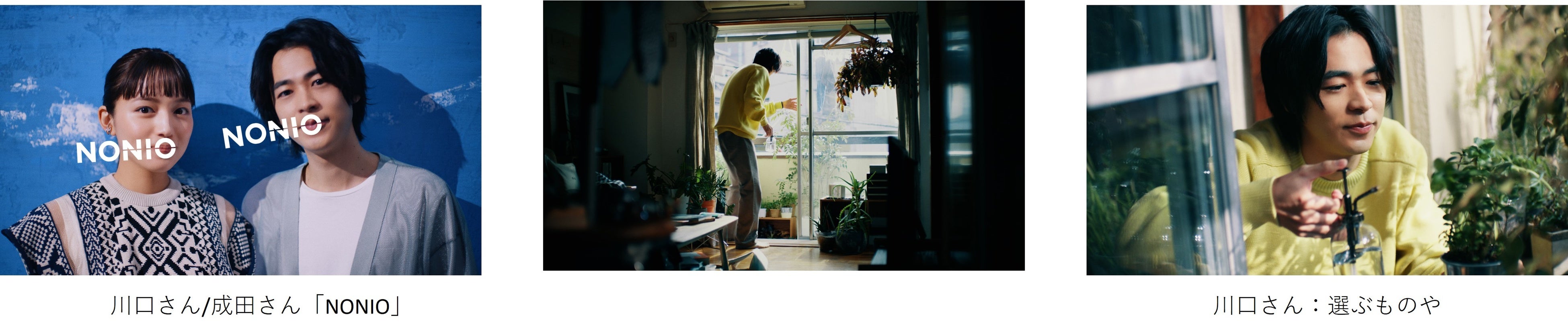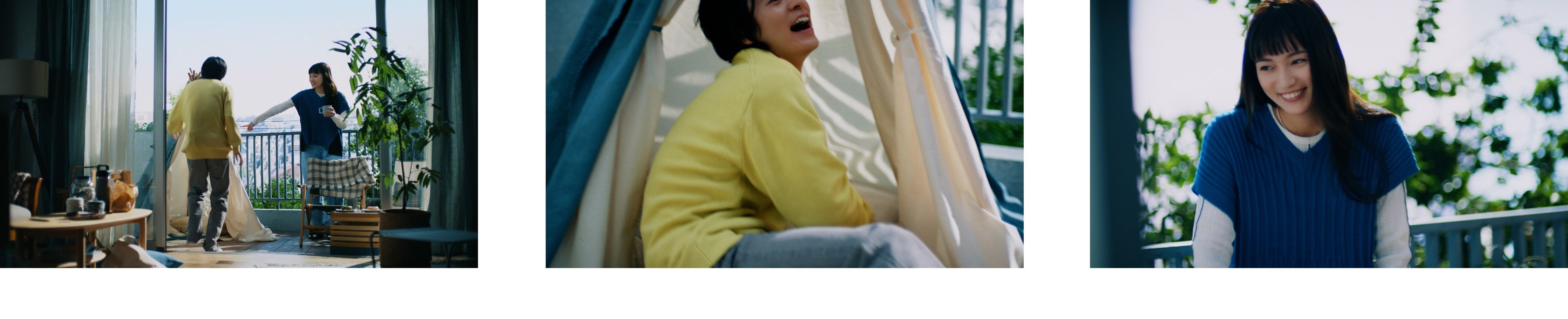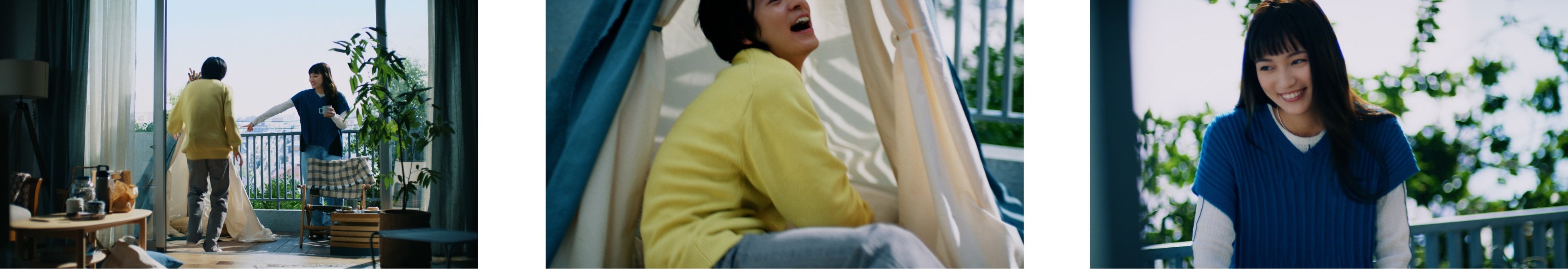 CMの見所は、友達以上恋人未満な二人の淡い関係性と若者たちの等身大の生活を表現した世界観。自宅に来る成田さんに、照れ笑いを浮べながら手を振る川口さんの姿や、川口さんが作ったベランピングに喜びながらテントに勢いよく入り、全力で楽しむ成田さんの天真爛漫な姿など、自然体なお二人の演技にぜひご注目ください。