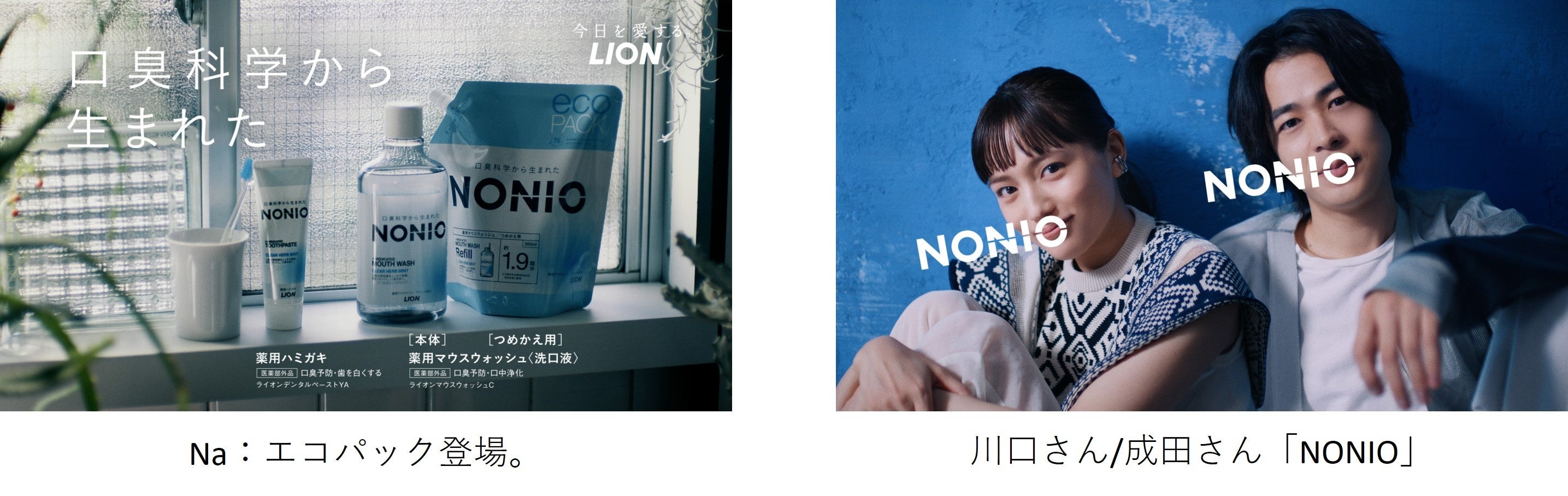 その第1弾として、ブランド初となる環境に配慮した「NONIOマウスウォッシュ つめかえ用 eco PACK」を2022年4月1日(金)から新発売いたします。併せて、川口春奈さんと成田凌さんが出演する新TVCM「世界を気持ちよく」篇を2022年4月9日(土)から全国で放映いたします。