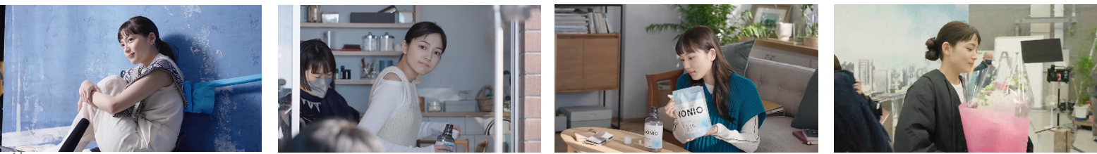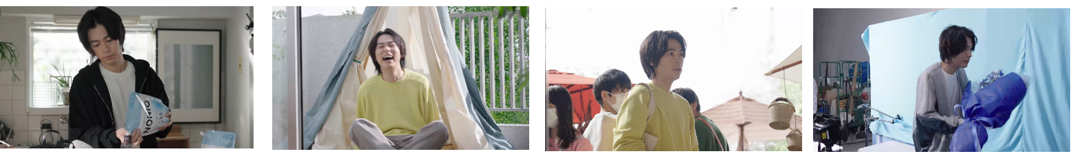深い青色の衣装で登場した川口さん。ベランピングのシーンでは、セットの植物や景色を見て黄昏るなど終始リラックスした様子でした。撮影は成田さん、川口さん別々に行われ、成田さん役のキャストと二人で話すシーンでは、カメラマンの指示で、ベランピングまた来てもいい?台風の日でも来ていい?といった質問攻めに、思わず手で顔を隠し笑ってしまう場面も。つめかえ用 eco PACKから本体に注ぐシーンでは、テキパキとした所作でこなす姿に、注ぎ方の上手さをスタッフに褒められる場面も見られました。