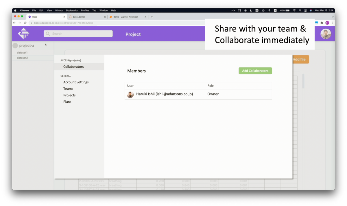 作成したデータセット(データファイル以外の学習に必要な情報)は簡単に共有することができ、共有された人はすぐに最新のデータセットを使用できます。本製品をクラウドストレージのように使用して受け渡しすることが可能です。