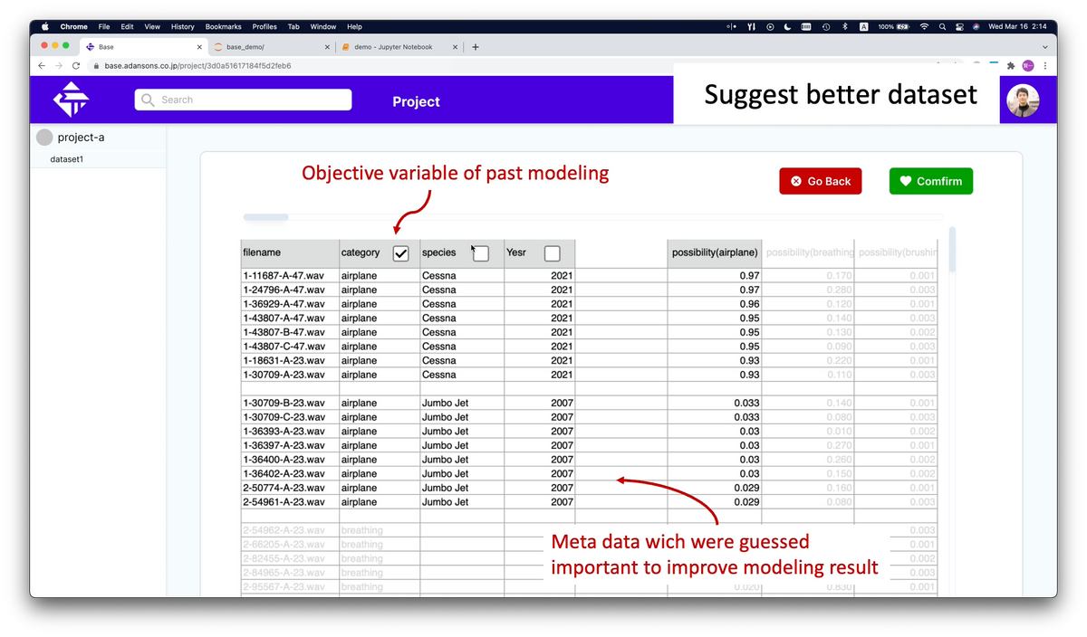 本機能は、AIの学習結果とデータセットの持つ情報を合わせて活用することにより、ユーザーの手元で簡単にデータセントリックなAI開発を可能にするレコメンドエンジンです。※β版, PCT国際出願中