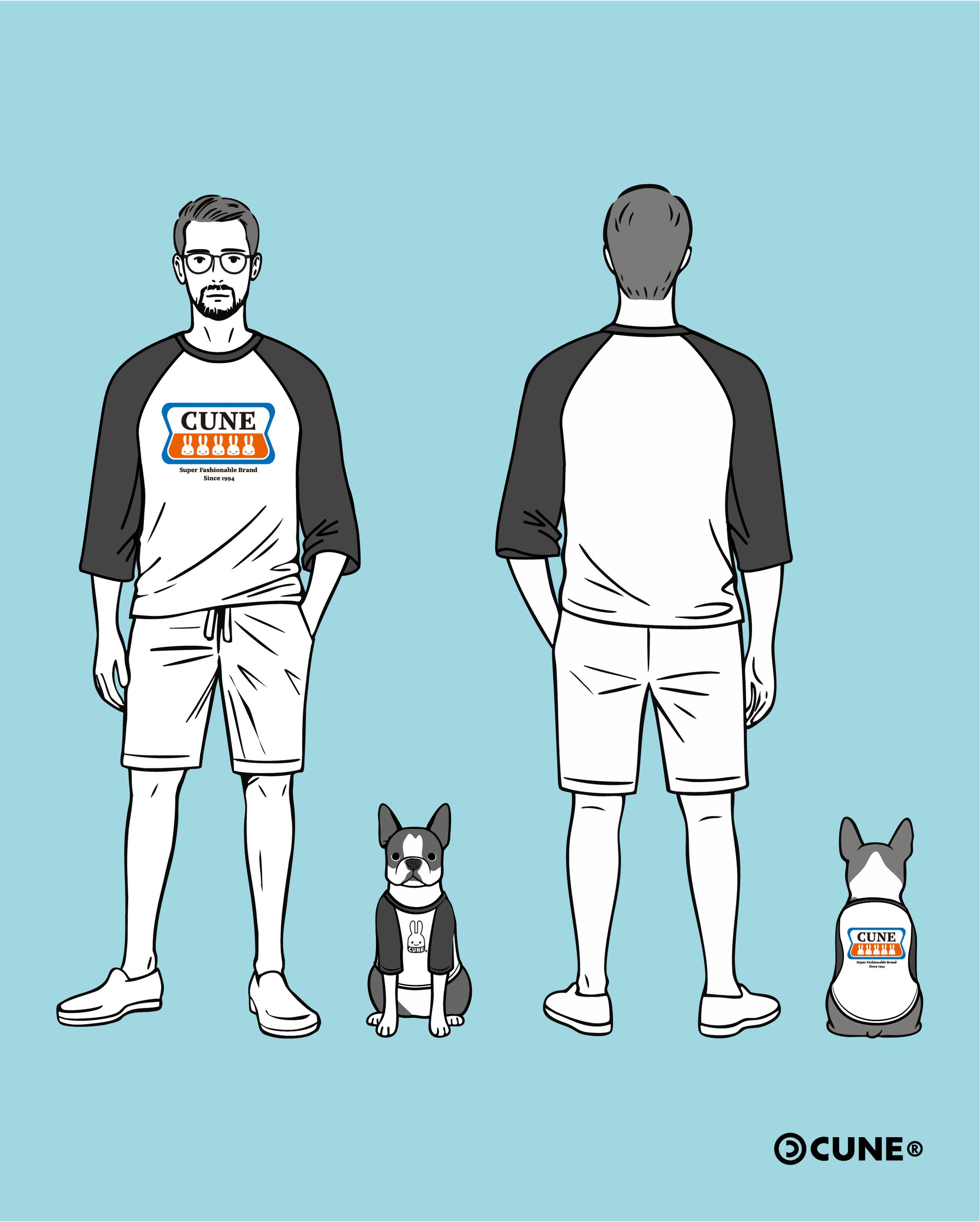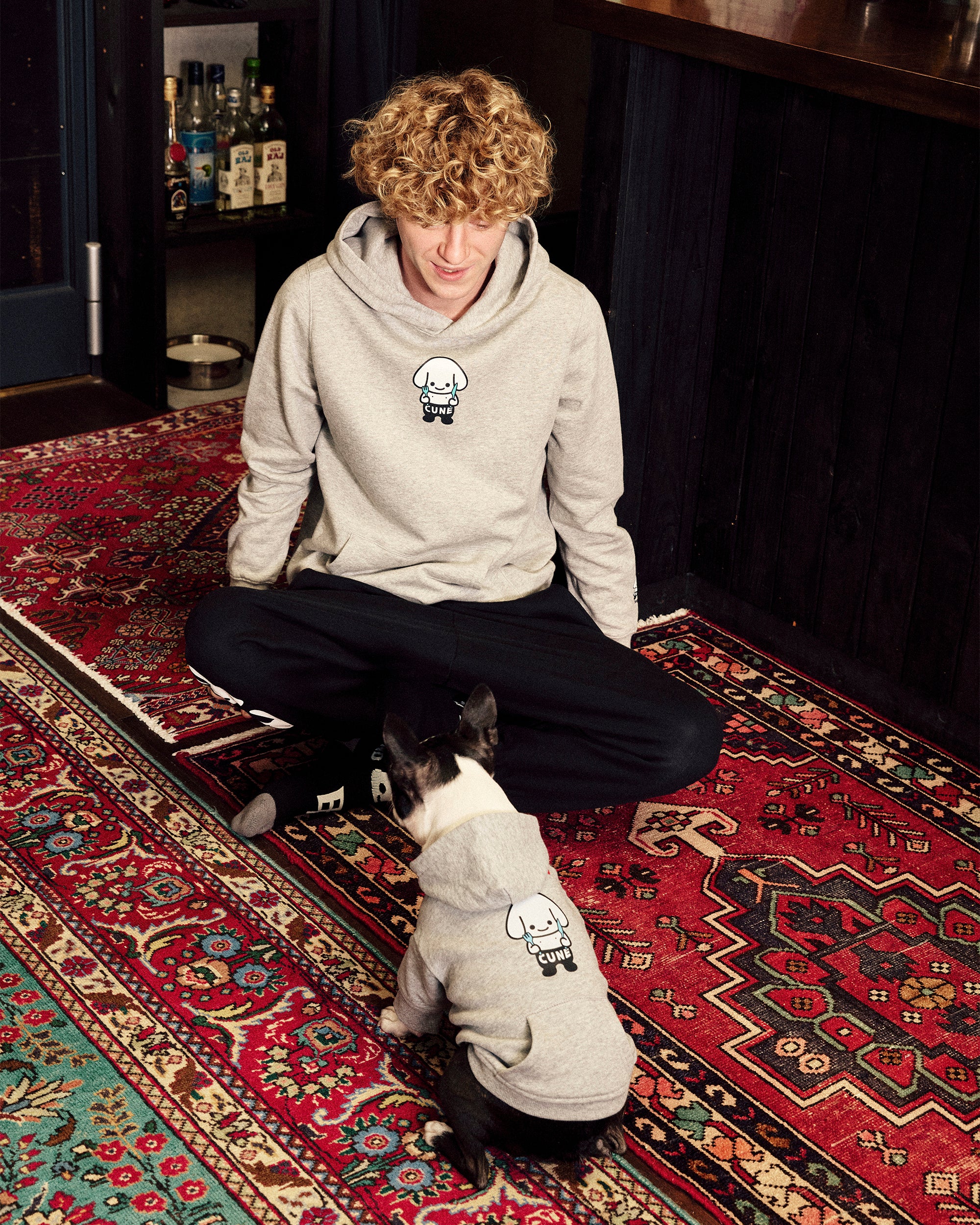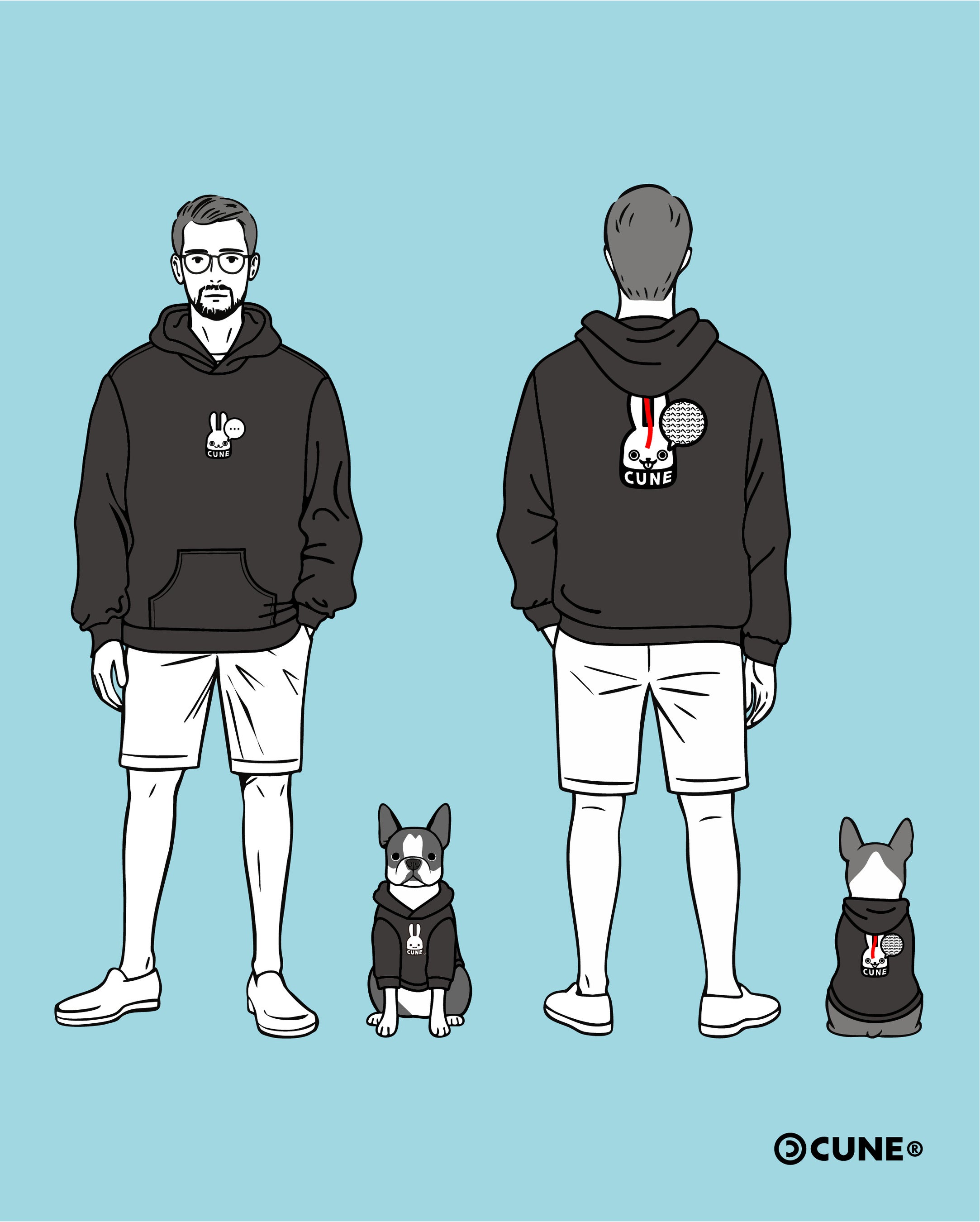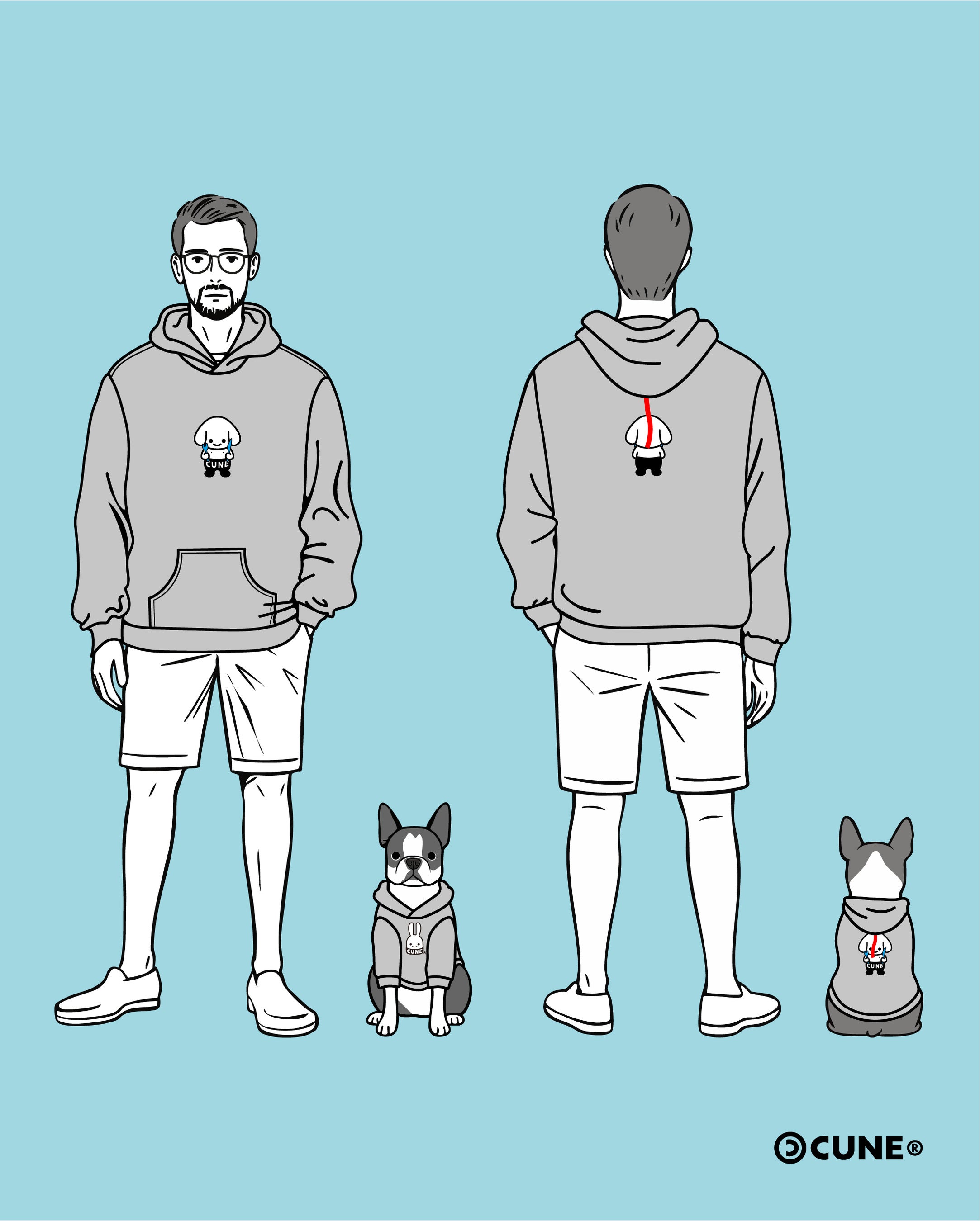 「犬と人でおそろい」をコンセプトに、CUNEの定番であるTシャツ/パーカーなどを犬サイズにアレンジし、縫製仕様などもほぼ同じく再現しています。