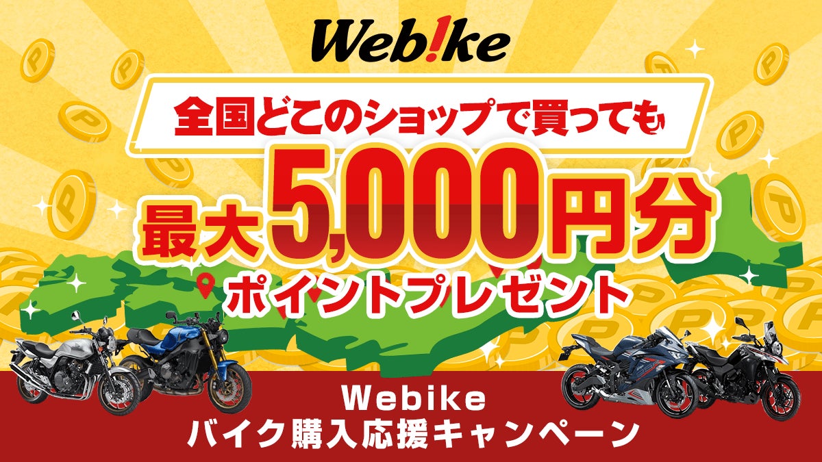 半年以内に全国のバイクショップで車両を購入されたお客様を対象に、車両本体価格の1%(上限5,000円分)のWebikeポイントをプレゼントするキャンペーンです。