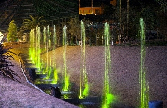 リズミカルに色を変えるミニ噴水が小川を彩ります。