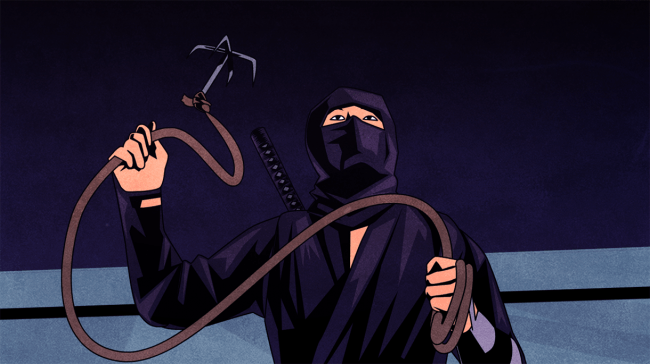 忍者アニメーション動画は、敵の城を舞台に忍者の任務(変装・侵入・戦闘・逃走)を紹介する内容です。