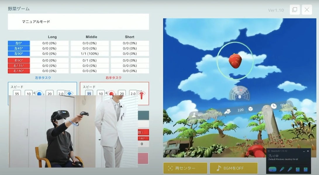 mediVRリハビリテーションセンターでは、mediVRカグラを使ったリハビリを提供します。mediVRカグラとは、VR(仮想現実)空間上に表示される対象に向かって手を伸ばす動作を繰り返すことで、姿勢バランスや重心移動のコツを掴んでいただくリハビリテーション用医療機器です。背景がシンプルで認知負荷が低い「水平ゲーム」「落下ゲーム」、注意障害を惹起するよう認知負荷を高めた「水戸黄門ゲーム」「野菜ゲーム」「果物ゲーム」を揃えています。2022年10月現在、mediVRカグラは全国47の大学病院やデイケア施設等に導入されています。