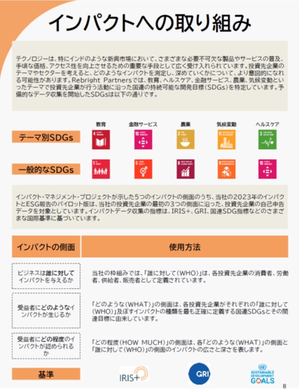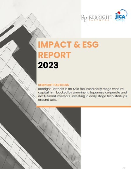 インド及びASEAN地域のシード・アーリーステージ投資に特化したベンチャーキャピタルのリブライトパートナーズは、投資先ポートフォリオ企業の社会インパクトとESG取り組みを可視化する『インパクト&ESGレポート2023』(以下、本レポート)を公開いたしました。本レポートは、新興アジアにおいてデジタルトランスフォーメーションによる産業・社会革新に取り組むスタートアップに投資し、経済的リターンを最大化する一方で、その活動の結果として実現される社会インパクトも可視化する、Rebright Partners 4号投資事業組合(以下、本ファンド)が、その投資先ポートフォリオの活動について同ファンドの出資者(LP)でもあるJICAよりインパクト測定ノウハウについての支援を受けて調査・策定したものです。本レポートは、ページ下部にあるお申込みフォームにご記入後、全編をご覧いただくことができます。