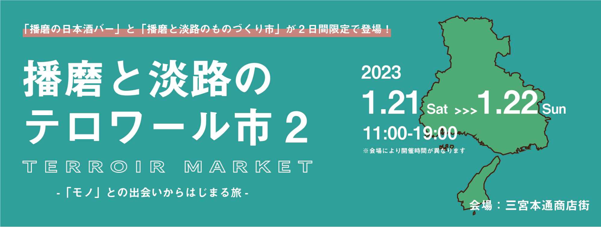 三宮本通商店街振興組合(神戸市中央区、代表理事:高井学)と三宮センターサウス町おこし会(神戸市中央区、会長:三浦繁男)は合同で、2023年1月21日(土)と1月22日(日)でエリア内の空き店舗を活用し、ひょうごの地域産品を紹介するイベント「播磨と淡路のテロワール市」を開催します。本イベントは昨年11月に大盛況だった「淡路島と香美町のテロワール市」に続く第2弾となります。