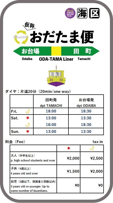 本サービスは、駅前再開発が進む田町と東京ウォーターフロントの象徴ともいうべきお台場海浜公園を定期運航で結び気軽な乗船機会を提供し、舟運の利便性と移動する喜びを実感していただくと同時に、原点であるタクシー(チャーター)運航の需要拡大に向けたブースターと位置付けています。