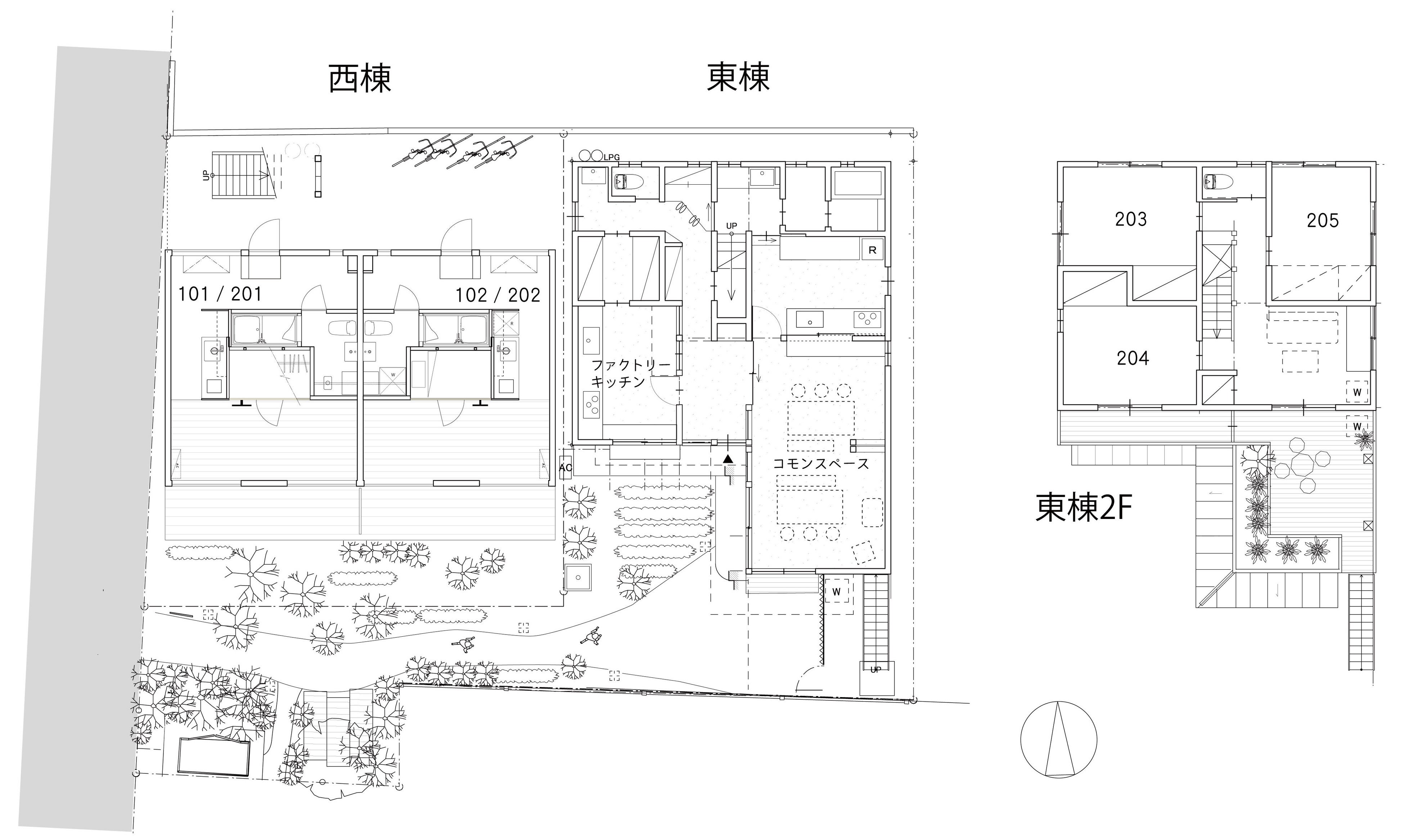 構成:シェア型貸室3戸、コモンスペース、ファクトリーキッチン