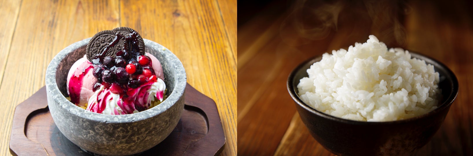 ■あまおう苺のストーンパフェ ¥599(税込 ¥659)/福岡県産米 元気つくし(中) ¥299(税込 ¥329)