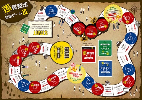 本教材はすごろく型のゲームで、生まれてから高齢者になるまでの消費生活に潜むさまざまなリスクに対して消費者として必要な力を楽しみながら身につけることができる内容になっています。今回の全面リニューアルでは、18歳で成人することによって待ち受ける消費者被害や、未成年者取消の効果についてすごろくの中で体験できるように工夫しています。