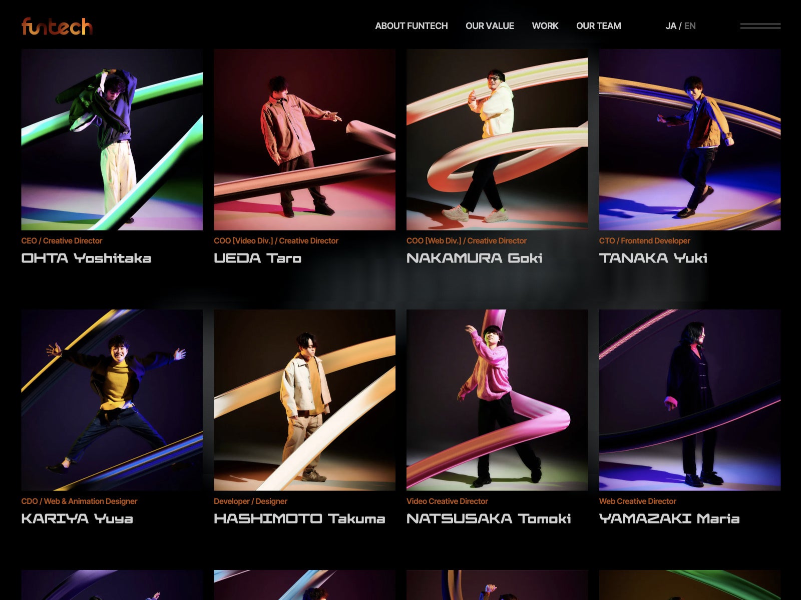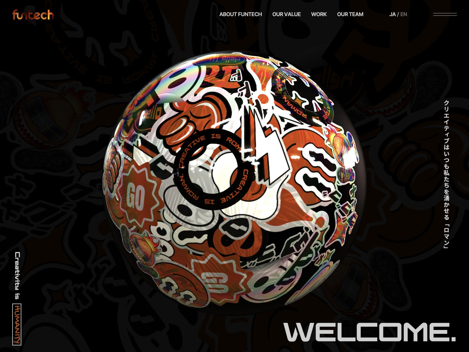 FunTechは、心を湧かせる新しいクリエイティブエクスペリエンスを生み出す会社です。 それを体現するものとして、弊社が持つアセットを総動員し、今できる最大クオリティで私たちのコーポレートサイトを制作しました。