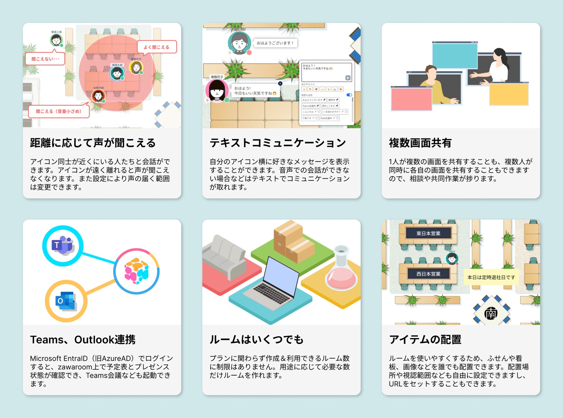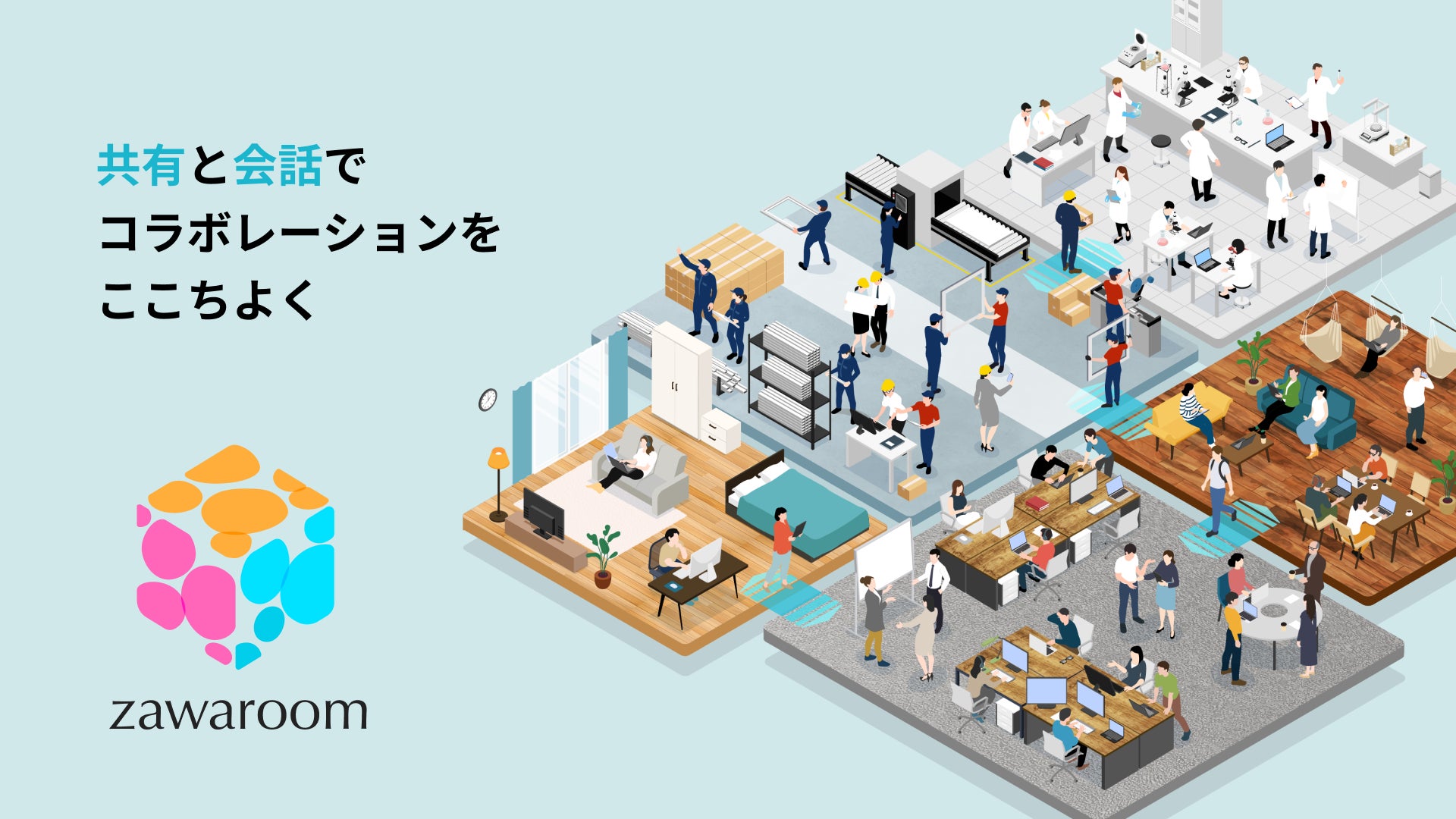 zawaroomはコラボレーションの場を提供するクラウド型の仮想オフィスサービスです。働く場所や働き方の垣根をこえて、チームとして一体感を持って仕事を進めることができる空間を提供します。