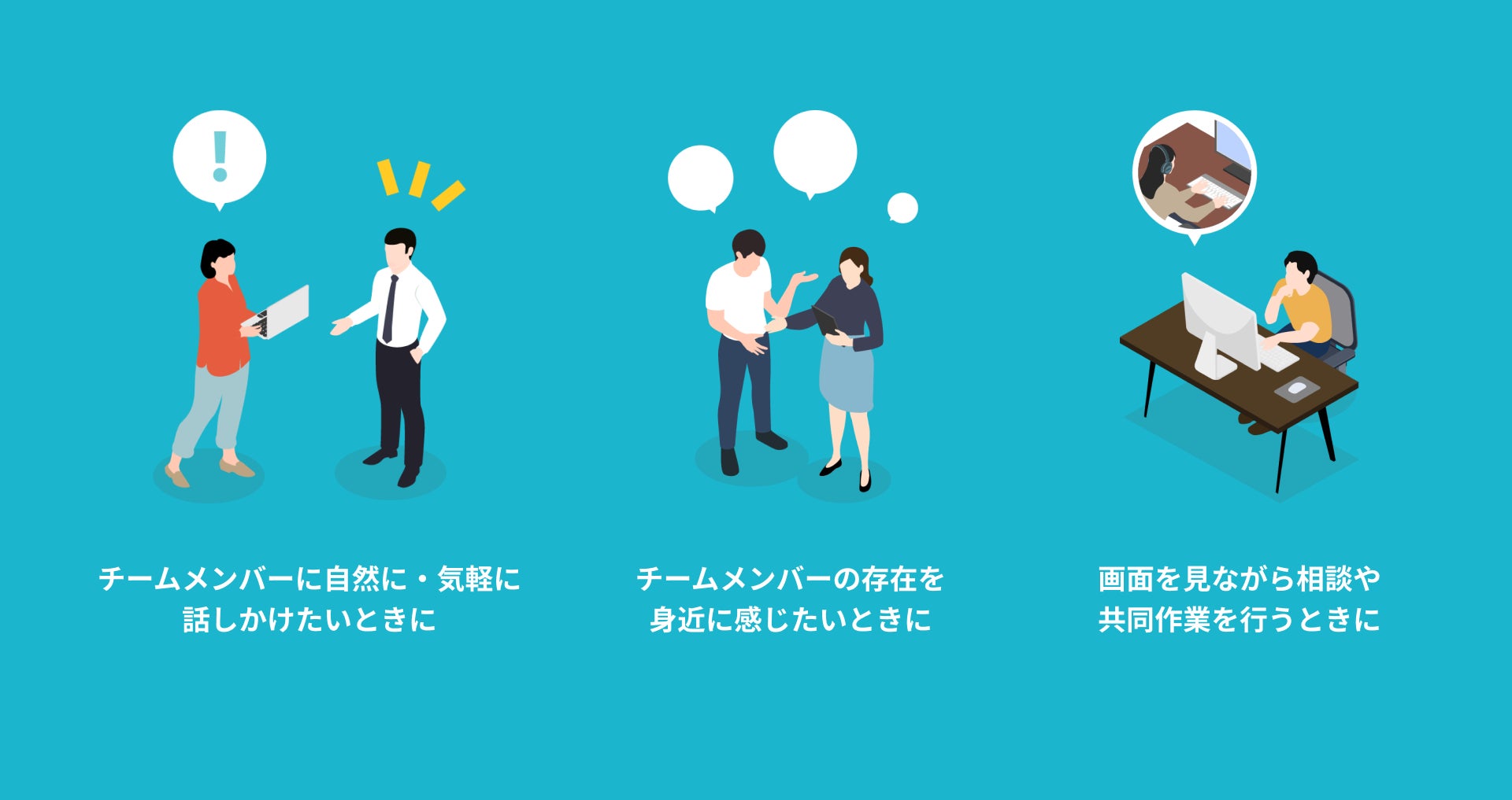 リモートワーク・ハイブリッドワークをしているときに、チームでのコミュニケーションをもっとここちよくしたいときはありませんか?このようなシーンでzawaroomの効果を体感いただけます。