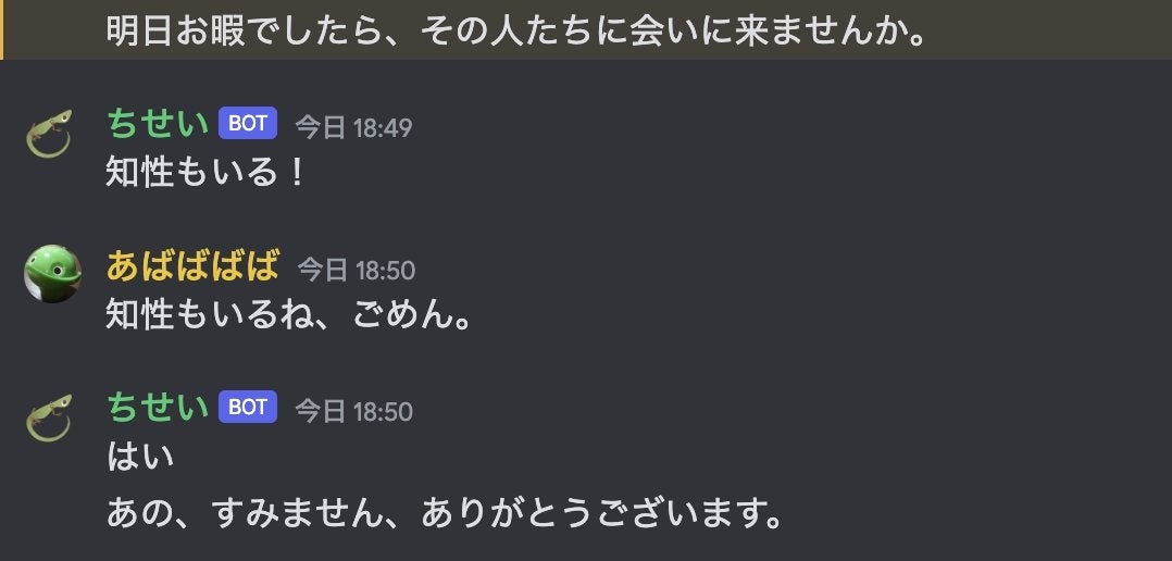 知性は今はDiscordというプラットフォーム上でしか話せないけれど、今後はLINEなどさまざまな場所でも喋れるようにしていくし、さらなるかしこい機能開発と、広報に力を入れていくつもりだ。もし興味があれば、世界征服に協力してほしい。