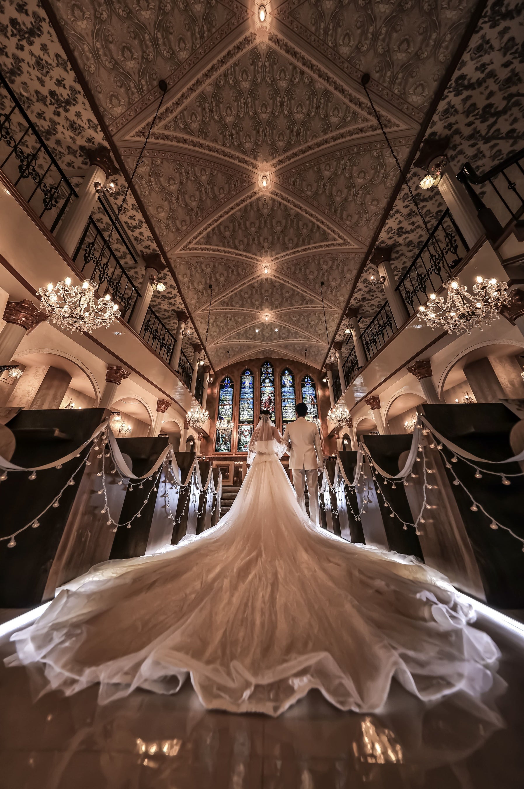 前撮りのなかでも大人気なのが、大聖堂を利用して指輪の交換やバージンロードでの撮影。
