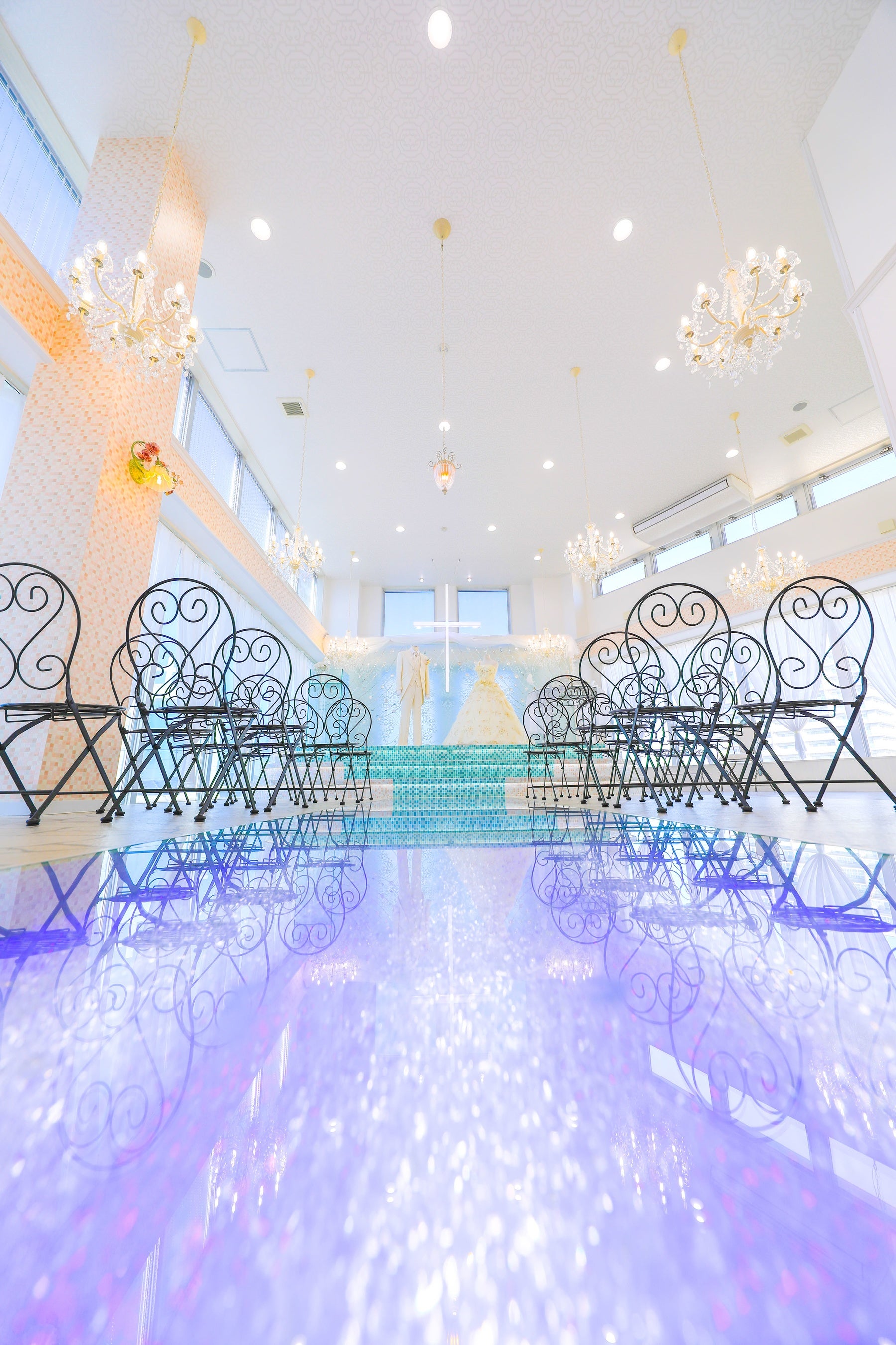 ヨーロッパの海や澄んだ青空を思わせるエメラルドグリーンの色彩美しいガラス細工を贅沢に装飾し、細部にわたりチャペル内の世界観により統一感を持たせました。