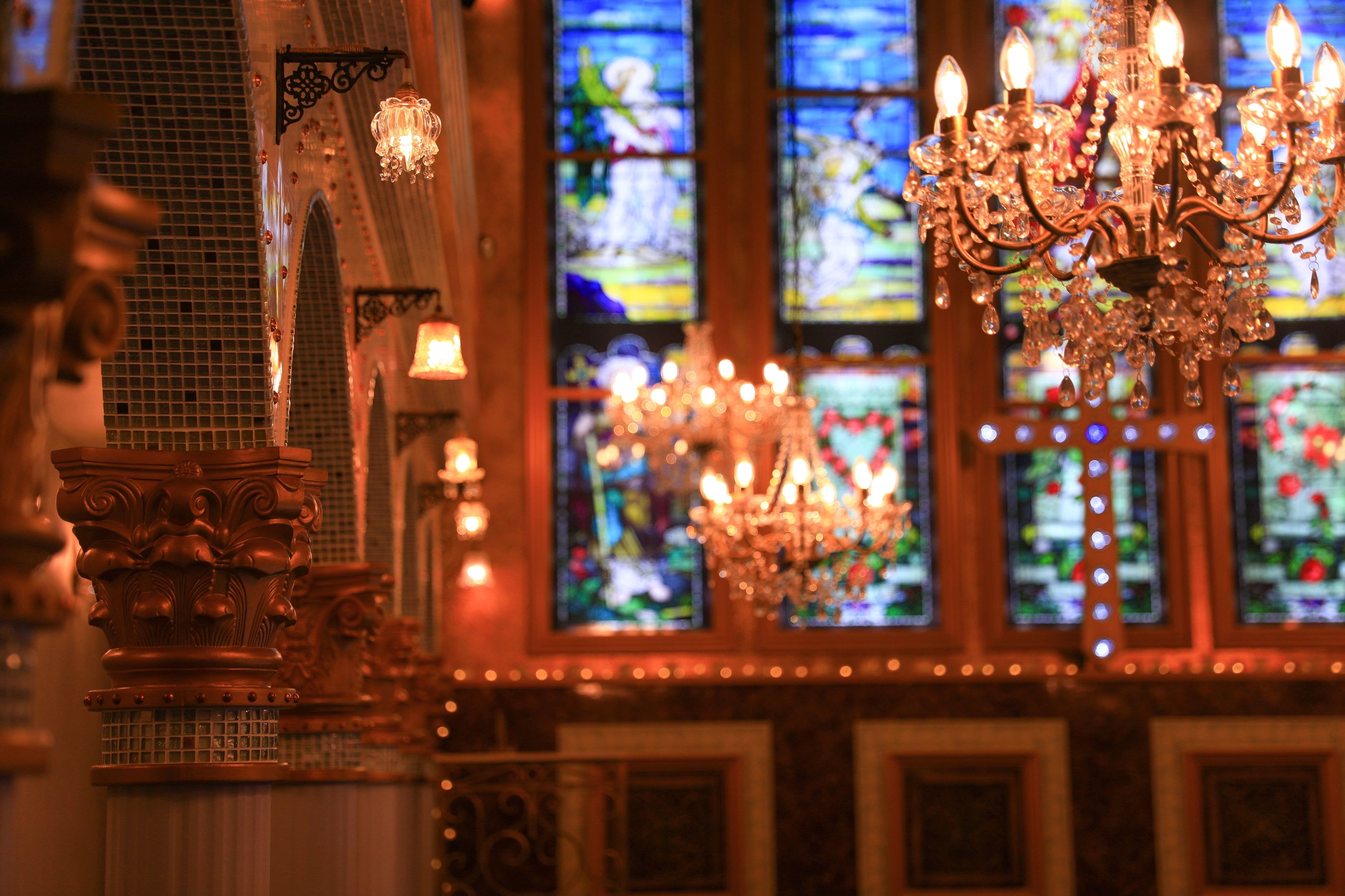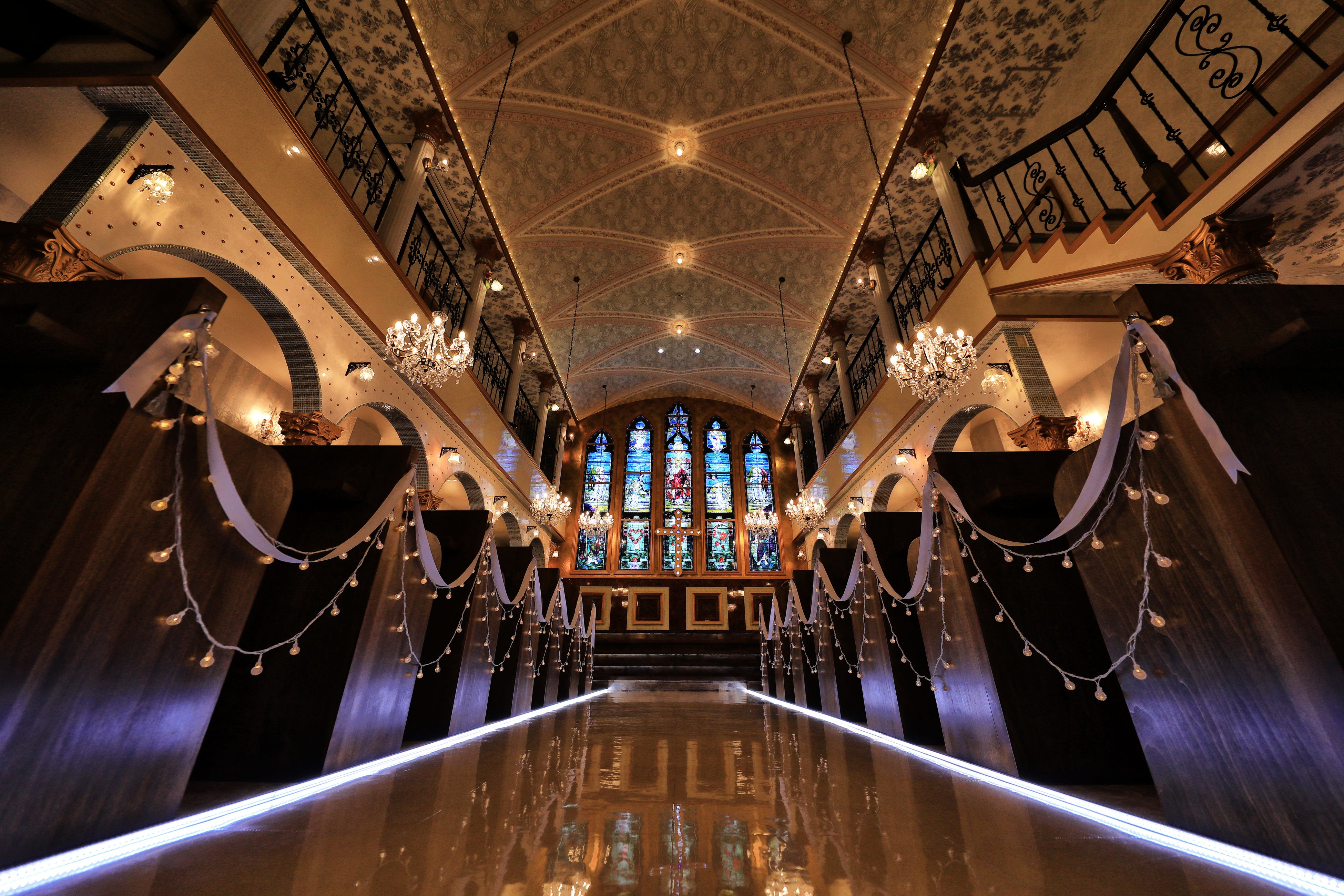 シャンデリアなどの照明の光をうけたガラス細工がキラキラときらめき、より大聖堂を輝かせた美しい空間となっています。