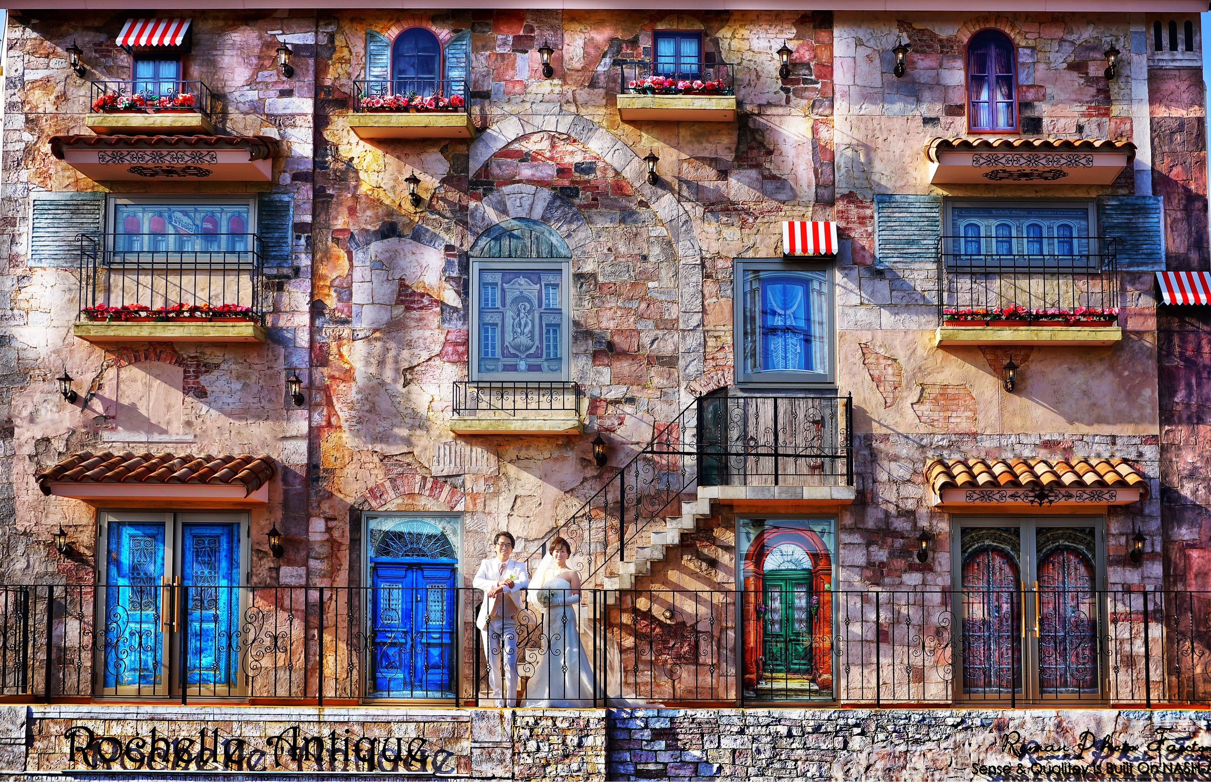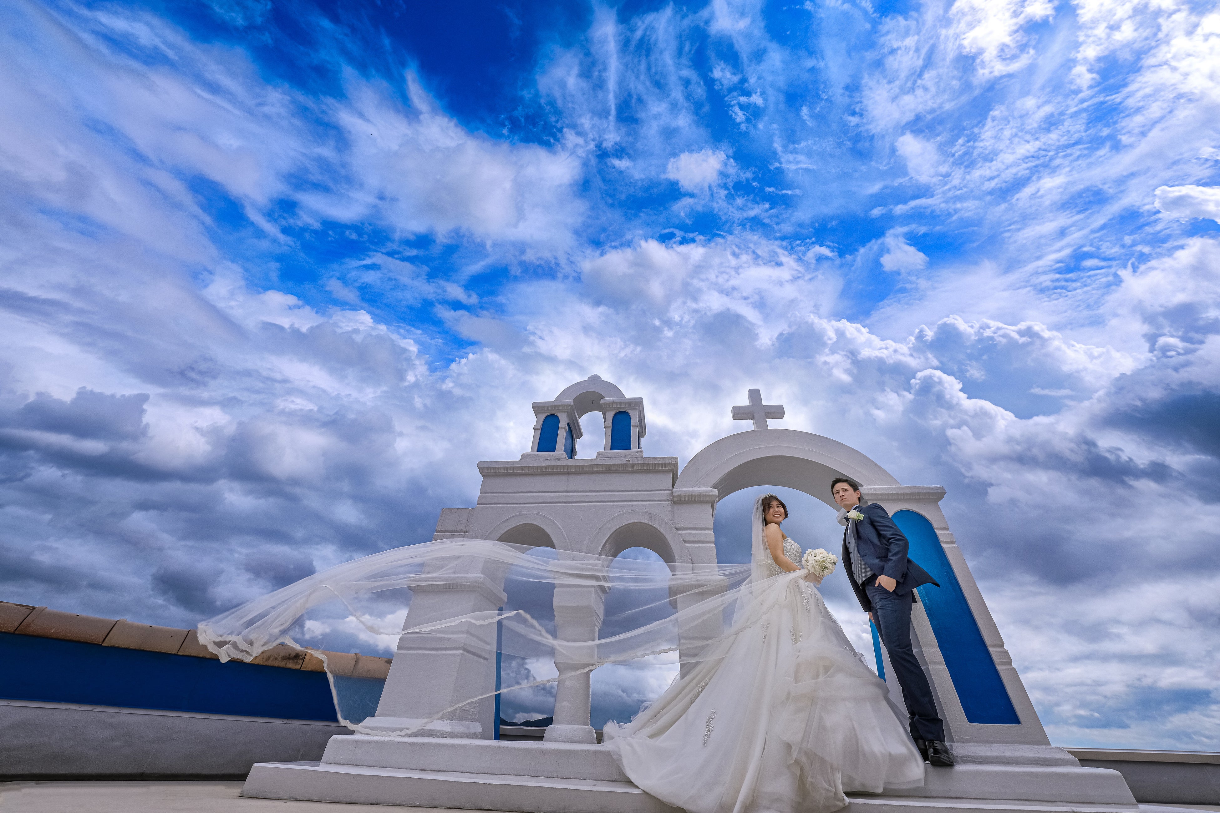 前撮りでも撮影スポットのひとつとして使用し、青空とともにここを背景に撮影すると日本で撮った写真には思えない異国情緒あふれるワンシーンが残せると新郎新婦様にとても人気です。