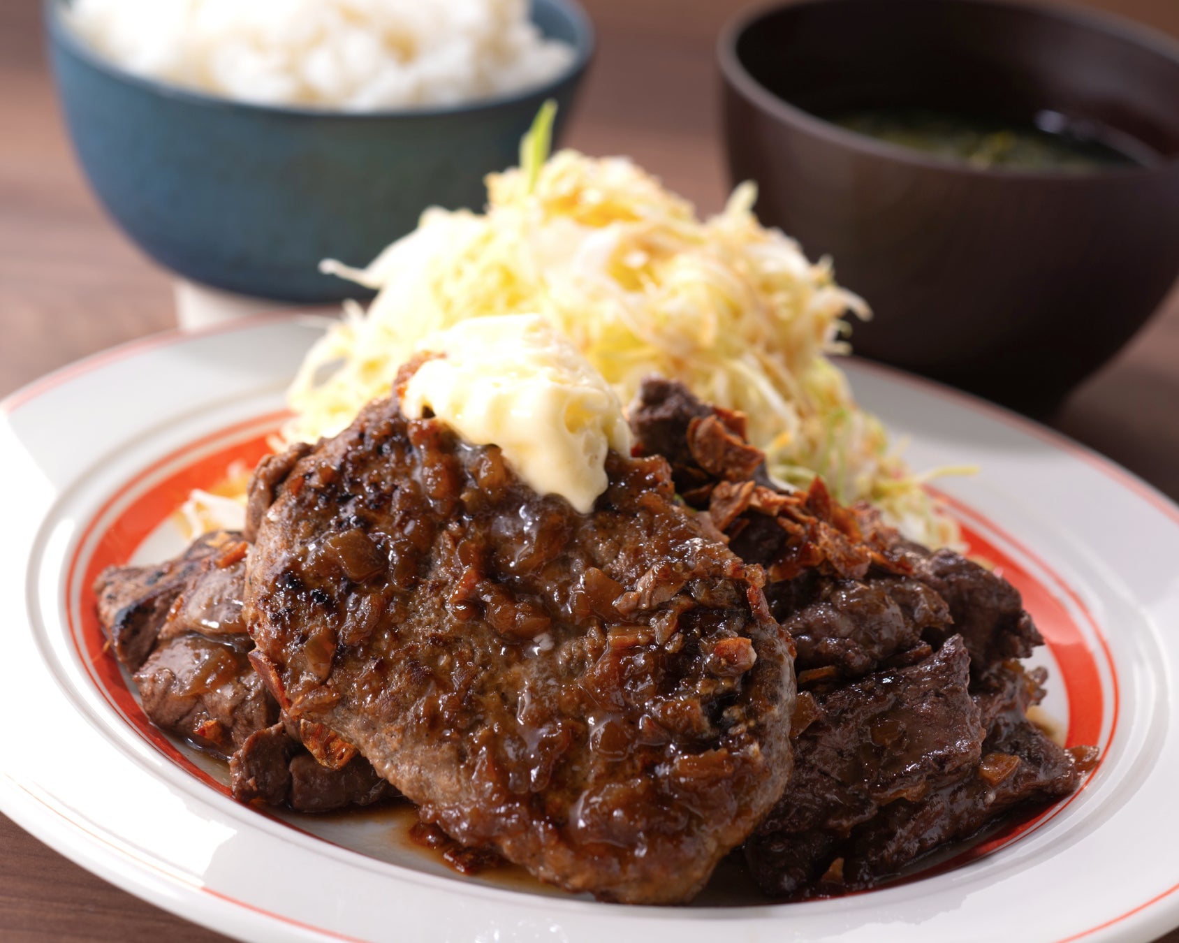 馬ヒレステーキご飯:希少部位の赤身を絶妙なレアに焼き上げ、塩コショウまたはシャリアピンソースで提供。