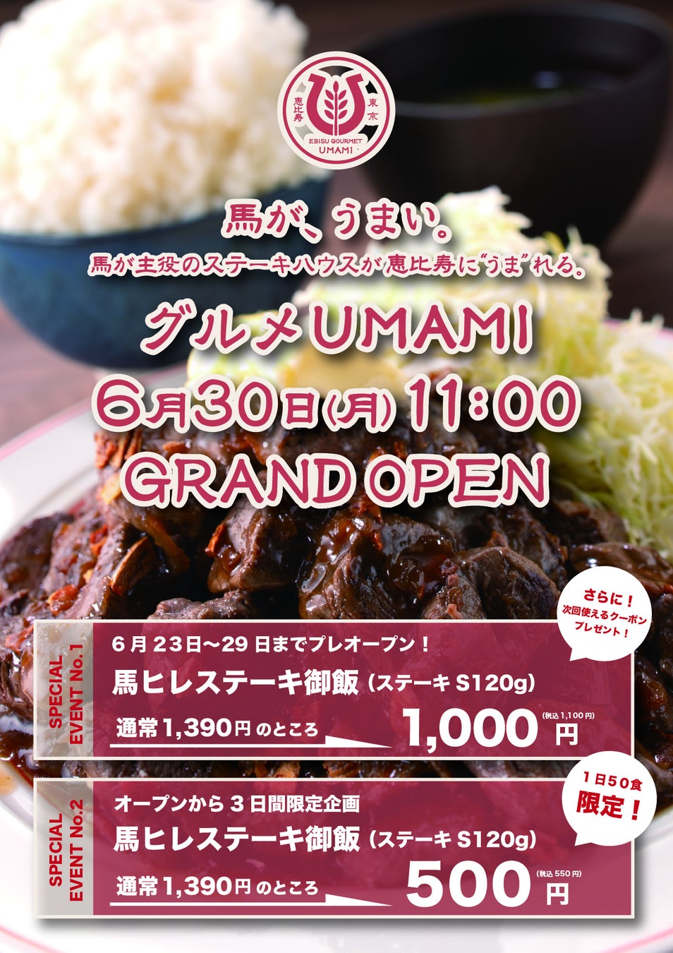6月30日恵比寿に馬肉ステーキ専門店「グルメUMAMI」がOPENします。