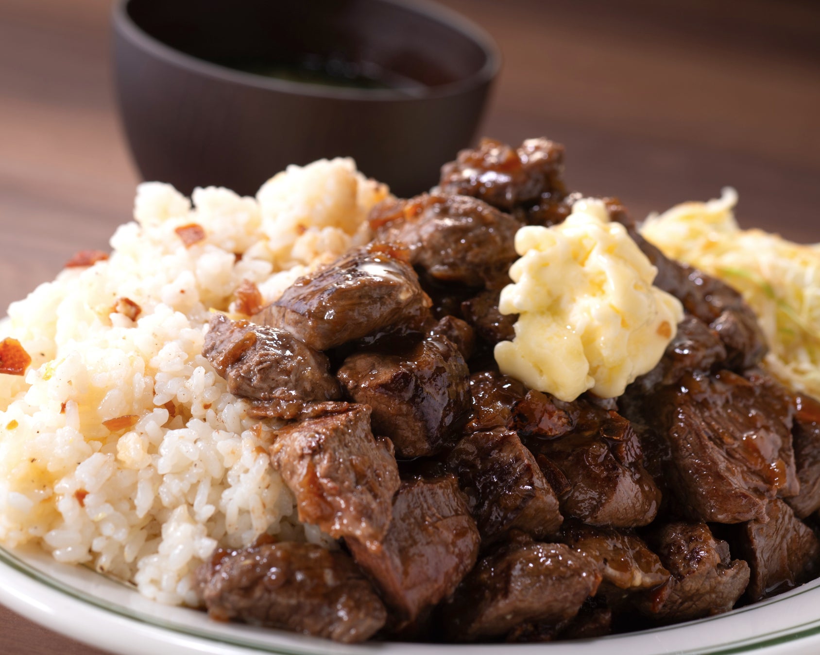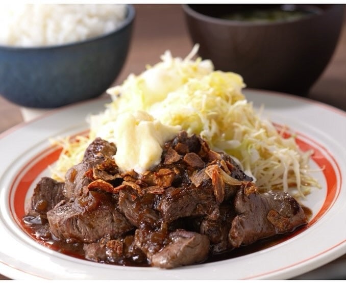 ガーリック馬ヒレステーキライス:特性のガーリックと相性抜群な馬ヒレ肉をワンプレーとで提供。