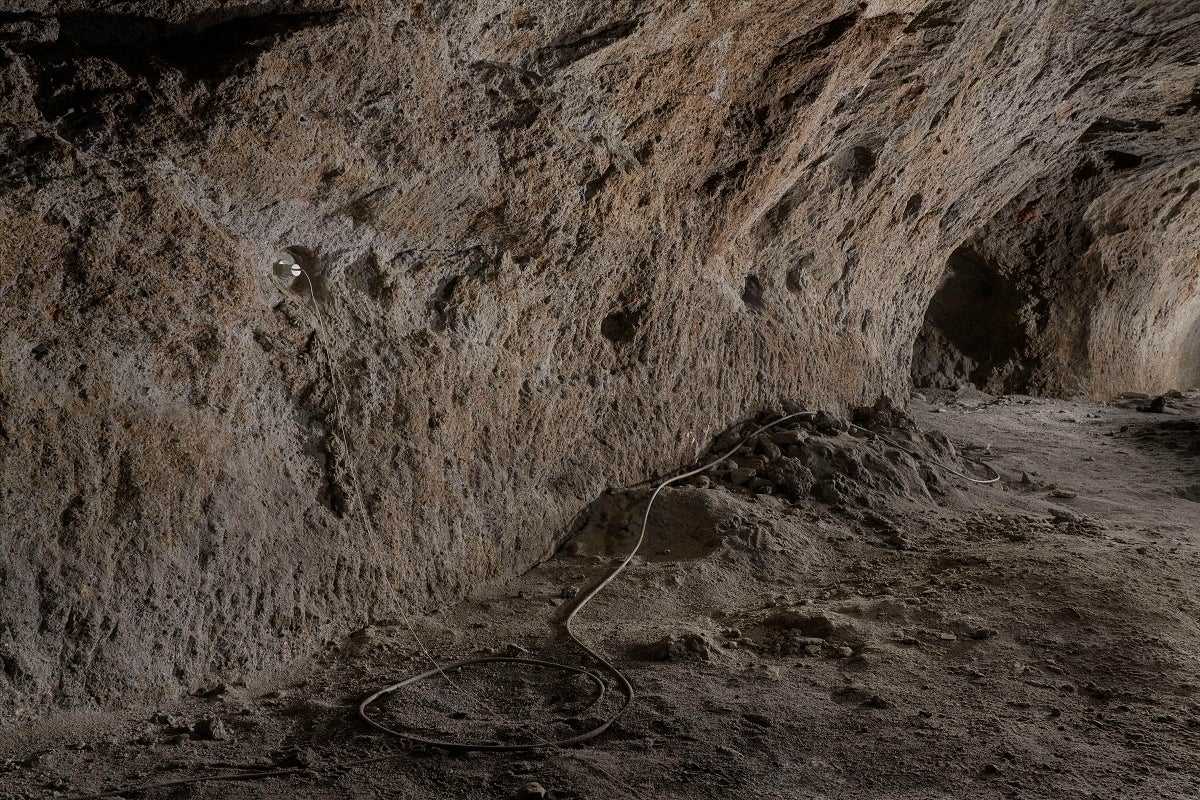 作品について:写っているのは私たちの⾜元、その地下空間に設置された地震の研究装置。京都⼤学地震予知研究センターが管理しているもので、戦時中に旧⽇本軍が作った地下壕を転⽤し、現在は地震の予知研究に役⽴てられている。普段は真っ暗闇の地下空間にライトを持ち込み、光源の位置を何度も変えながら複数枚撮影。そしてそれらを重ね合わせて、1枚の画像に合成した。可視化された⾵景は現実には存在せず、この写真にのみ映し出される。