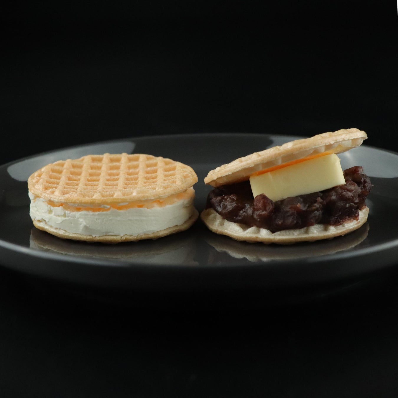 最中といえば餡を「包む」ものですが、ワッフル型は「はさむ」事でクリームや具材によって層を作れるので断面が鮮やかな見た目になります。原料が和素材なのでクリームを挟むだけで「和風洋菓子」になりますし、洋風デザインなので餡バターを挟むだけで「洋風和菓子」にする事も出来ます。