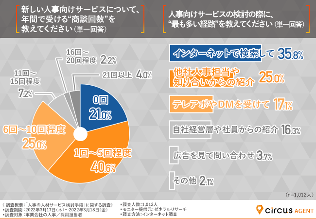 そこで今回、『circus AGENT(サーカスエージェント)』(https://circus-group.jp/circus/forrecruiting/)を運営するcircus株式会社は、事業会社の人事/採用担当者を対象に、「人事向けサービスの検討手段」に関する調査を実施しました。