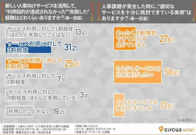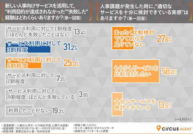 しかしながら、人事/採用担当者の3人に1人が、5割以上の確率でサービスを利用して失敗しており、「検討時に取得できる情報の質と量」ともに課題があることが分かりました。