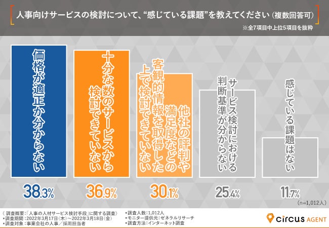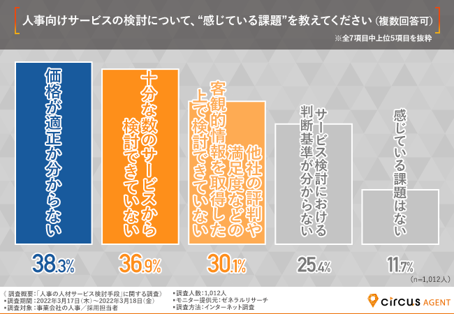 「人事向けサービスの検討について、“感じている課題”を教えてください(複数回答可)」と質問したところ、『価格が適正か分からない(38.3%)』と回答した方が最も多く、次いで『十分な数のサービスから検討できていない(36.9%)』『他社の評判や満足度などの客観的情報を取得した上で検討できていない(30.1%)』と続きました。