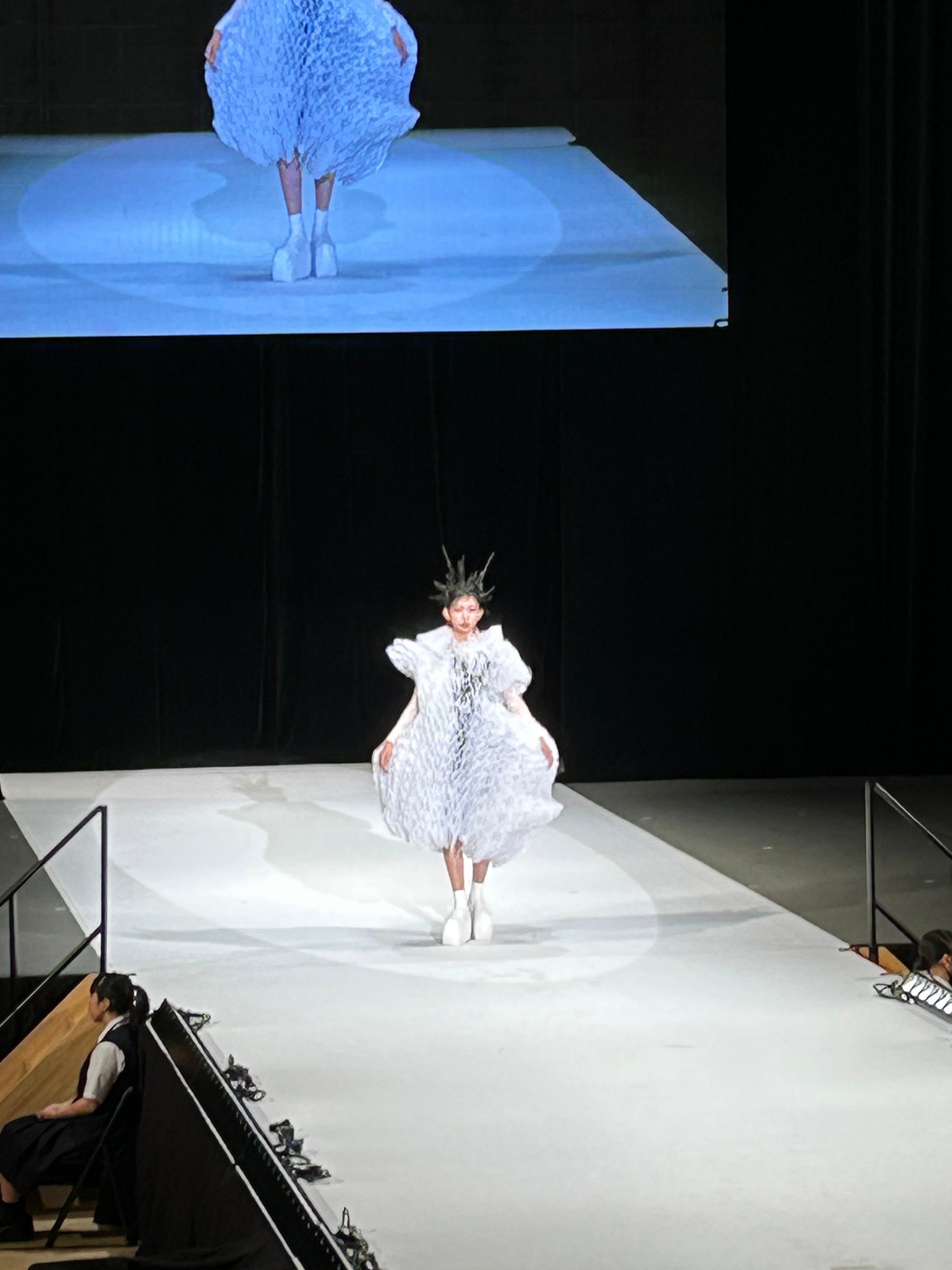 茂木さんの最終審査会出場に伴い、秋濱優奈さん(同学年・専攻)がモデルを引き受けました。茂木さんとともに衣装制作を行い、当日はデザイン画から忠実に再現された衣装を完璧に着こなし、凛々しいまなざしで堂々とウォーキングしました。
