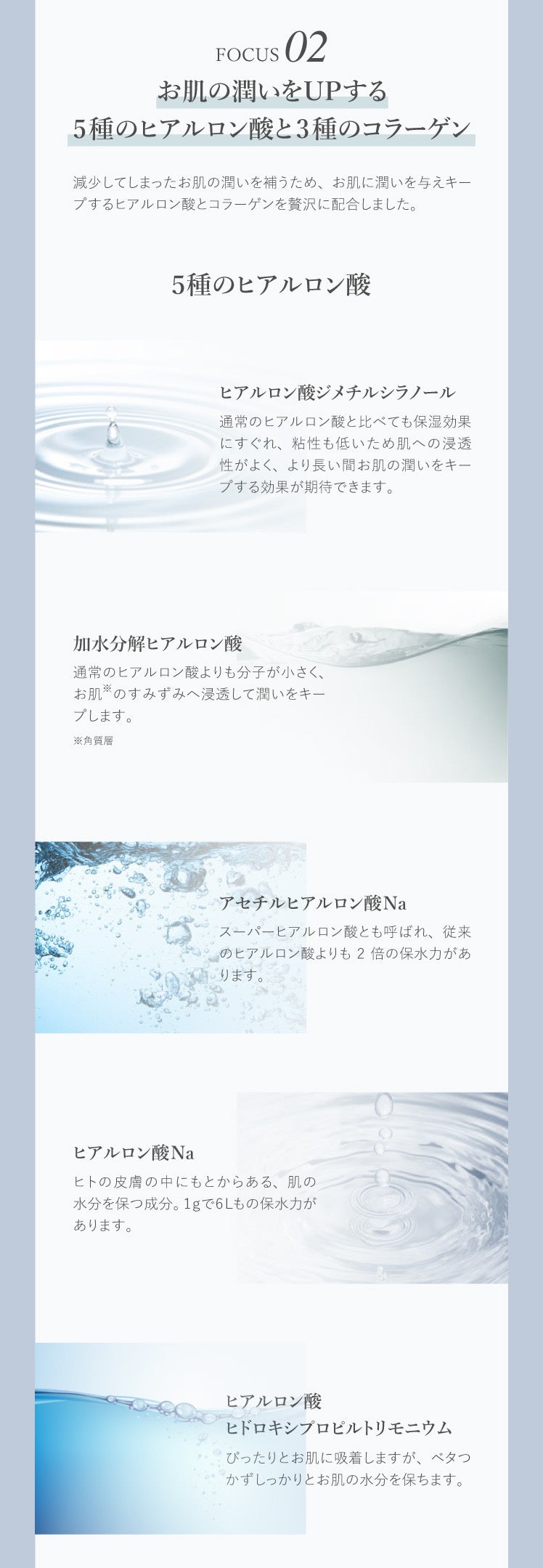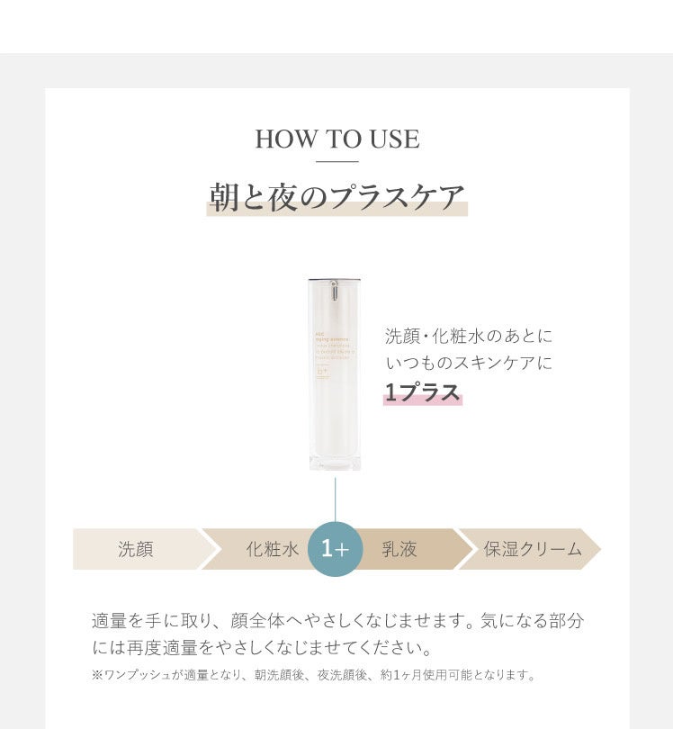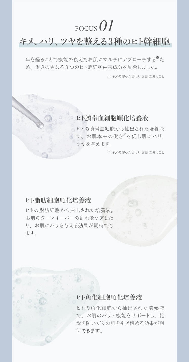 エイジングに特化した『3種のヒト幹細胞(肌のキメを整え、潤いやハリを与えることで肌荒れを予防、健康的な肌に導く)』『5種のヒアルロン酸(高い保水力で、肌の潤いをキープし、みずみずしい肌を作る)』『3種のコラーゲン(肌の表面の水分を保ち、外部からの刺激を緩和させる)』の3つの成分を贅沢に使用しております。