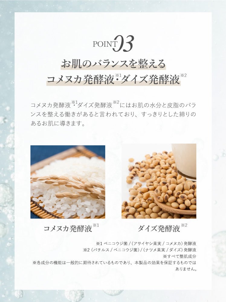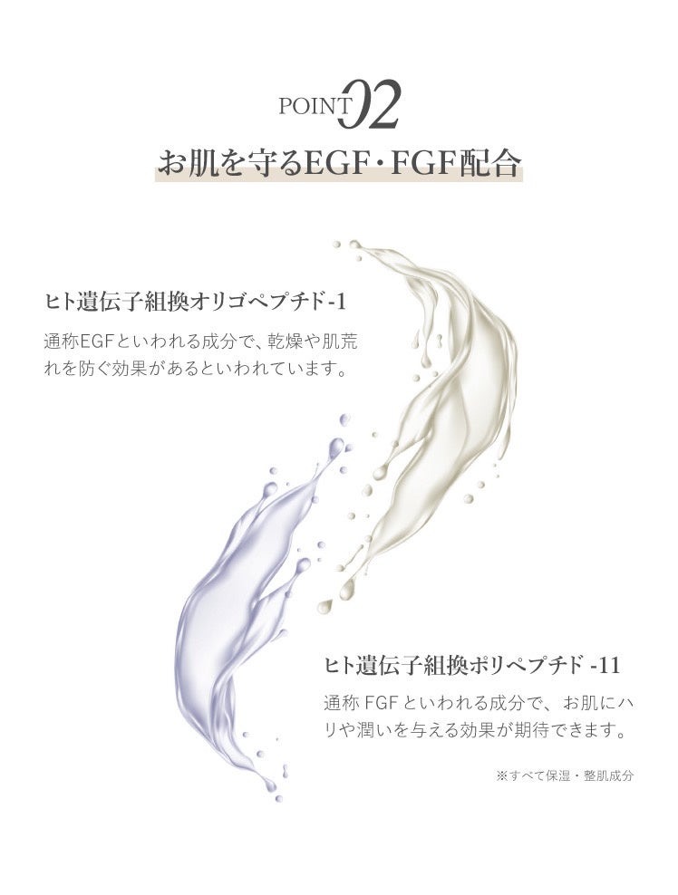 また、お肌の生まれ変わりを促進させ、乾燥や肌荒れを防いで美肌を作る『EGF』、コラーゲン・スクワランを量産して肌の弾力を保ち、ハリと潤いを与える『FGF』の肌を保護する成分も配合しております。
