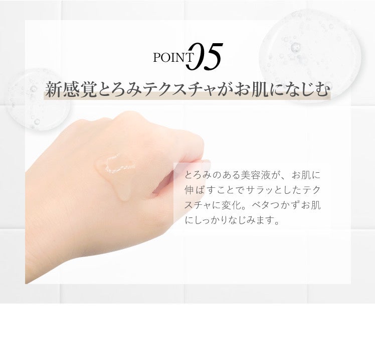 新感覚のとろみテクスチャは非常に伸びがよく、馴染ませた瞬間、肌がもっちり・ふっくらとする使用感で、敏感肌の方にもお使い頂ける〈香料・合成色素・パラベン・鉱物油〉不使用の、4つのフリー処方となっております。
