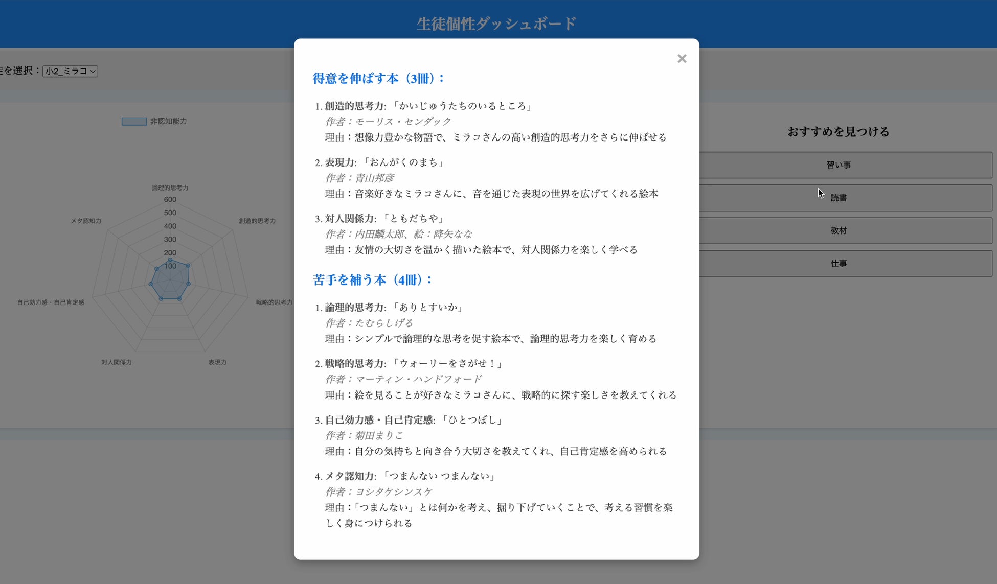 ミライ式で発表してくれた子どもたちの「意見データ」をもとに、AIが子どもたちの可能性をレコメンドしていきます。現在は、おすすめの習い事・読書・教材・仕事などがレコメンドできます。