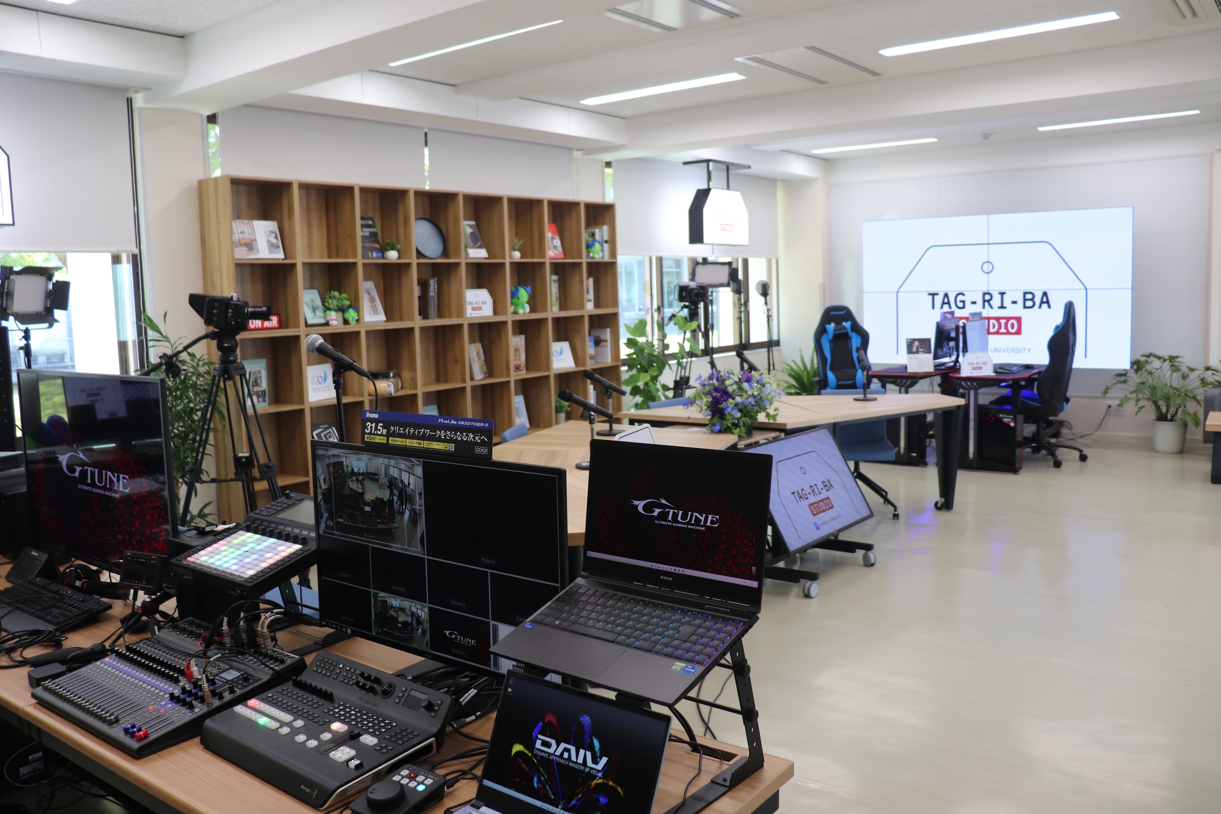 TAG-RI-BA STUDIOは、「いつでもどこでも、つながる。学べる。発信できる。」をコンセプトに本学の学生や教職員が利用できる、ライブ配信設備を備えたスペースです。優美なライブ配信スペースに加え、本格的なライブ配信のプロ機材を多数取り揃えた、「全国の大学でも有数の規模となる多目的ライブ配信スタジオ」となります。