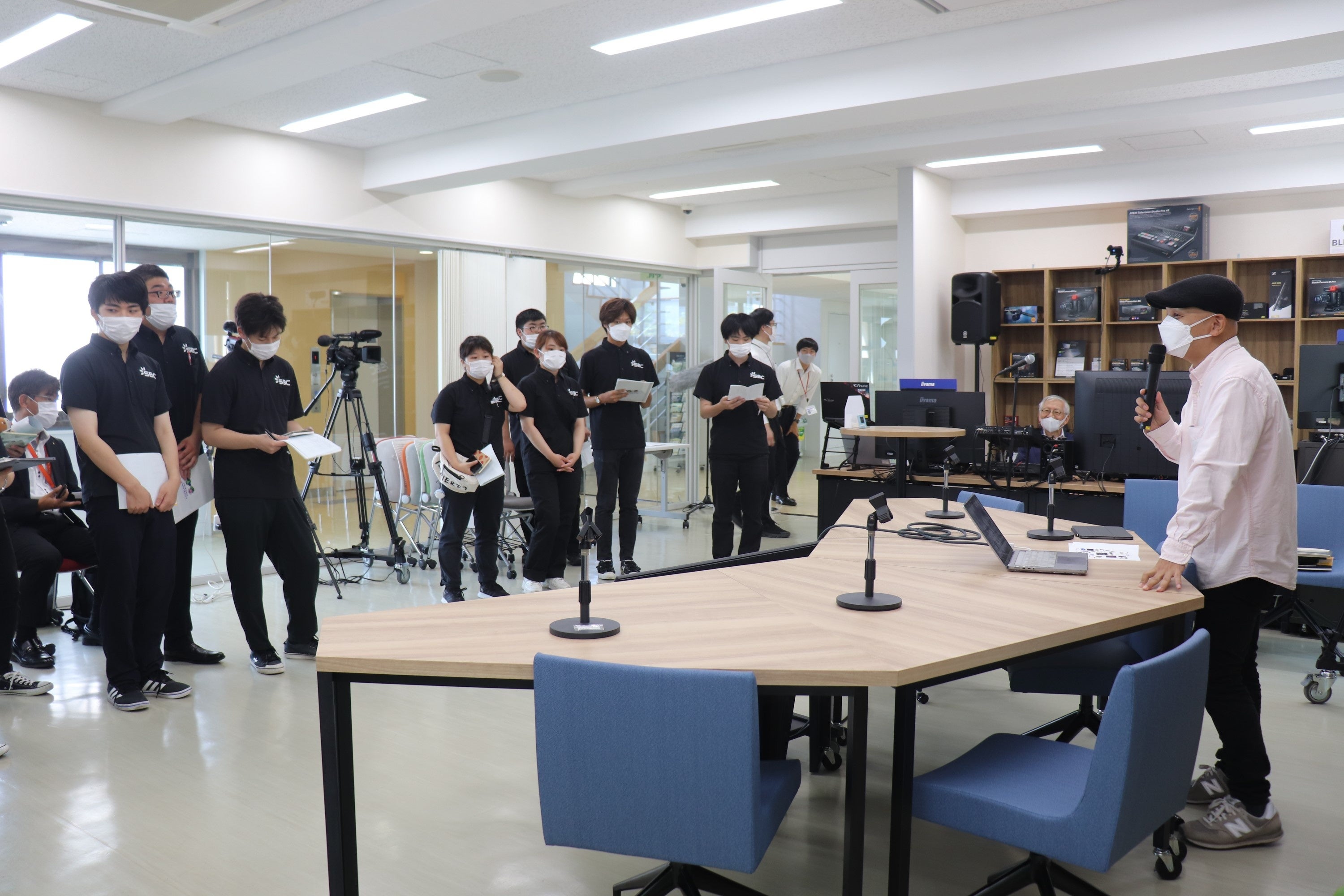 スマホから業務用機器までライブ配信とウェビナーの現場をこなす、ノダタケオ氏が四国大学放送局員を対象に、ワークショップを行いました。