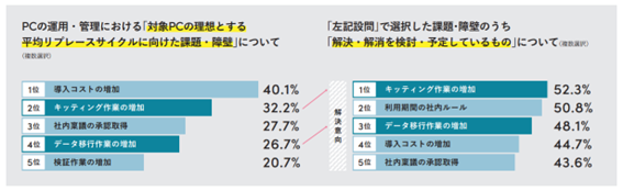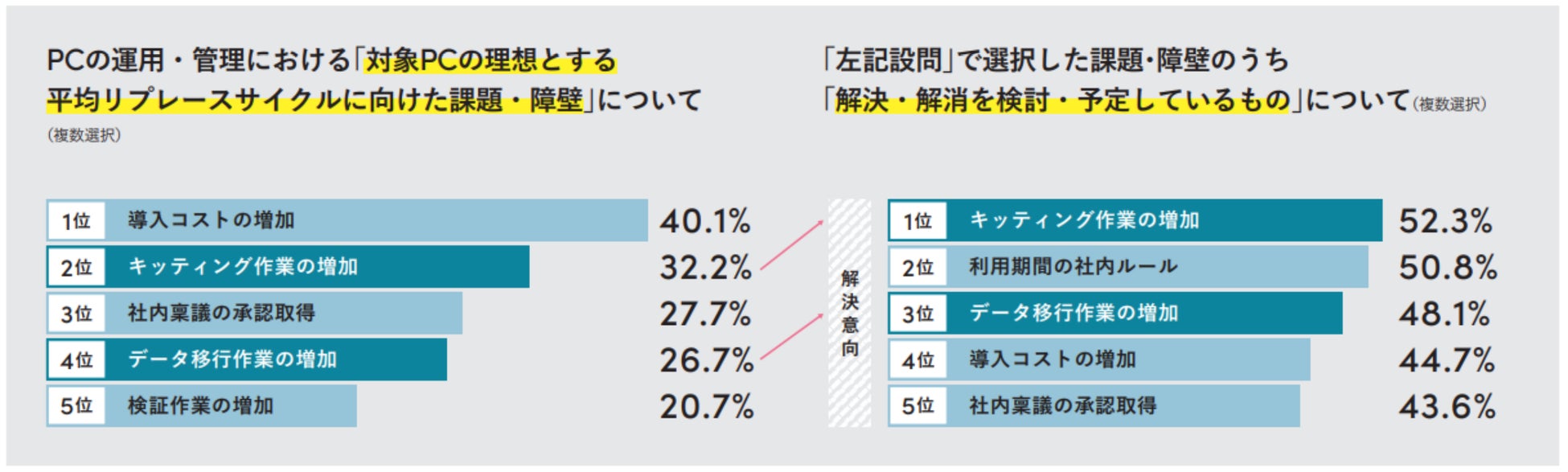 『リプレースサイクル理想化の障壁』については、「導入コスト増加」が最も多く、「キッティング作業増加」が続きます。課題・障壁のうち『解決・解消を検討・予定しているもの』については、「キッティング作業の増加」が最も多く、3位には「データ移行作業増加」があがりました。この結果から、部門主体で解決方法を検討し、実行に移せる課題に目を向け、解決に向けて実際に情報収集や採用を検討している傾向が強いものと考えられます。