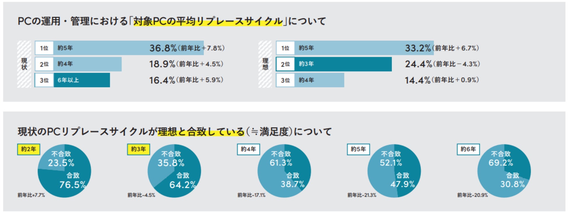 『現状のリプレースサイクル』は「約5年」「約4年」「6年以上」と長期化傾向の一方で、『理想のリプレースサイクル』は「約5年」「約3年」「約4年」という結果となりました。