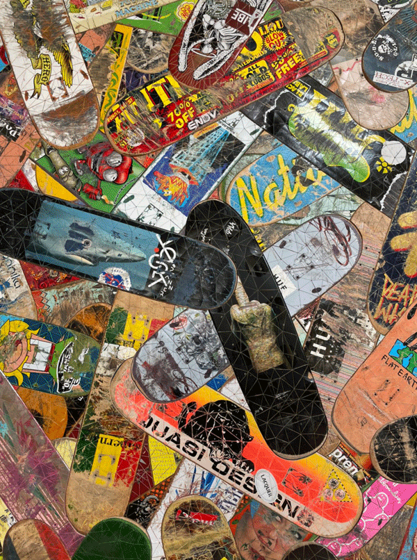 Haroshi は、2003年より独学で習得した技法を駆使し、スケートボードデッキの廃材を使った彫刻作品、インスタレーションを制作しています。故キース・ハフナゲルのストリートブランド HUF とのコラボレーションや、BATB のトロフィーなどを通じて、現代のストリートカルチャーの深層を体現する数少ないアーティストの一人として、絶大な支持を集めています。2018年には、Art Basel Miami Beach の NOVA セクションにおける個展、2019年から2020年にかけて、Jeffrey DeitchのNYとLAを巡回した「Tokyo Pop Underground」にて、この展覧会を象徴する 5m 四方の大作のインスタレーションを発表し、大きな話題となりました。