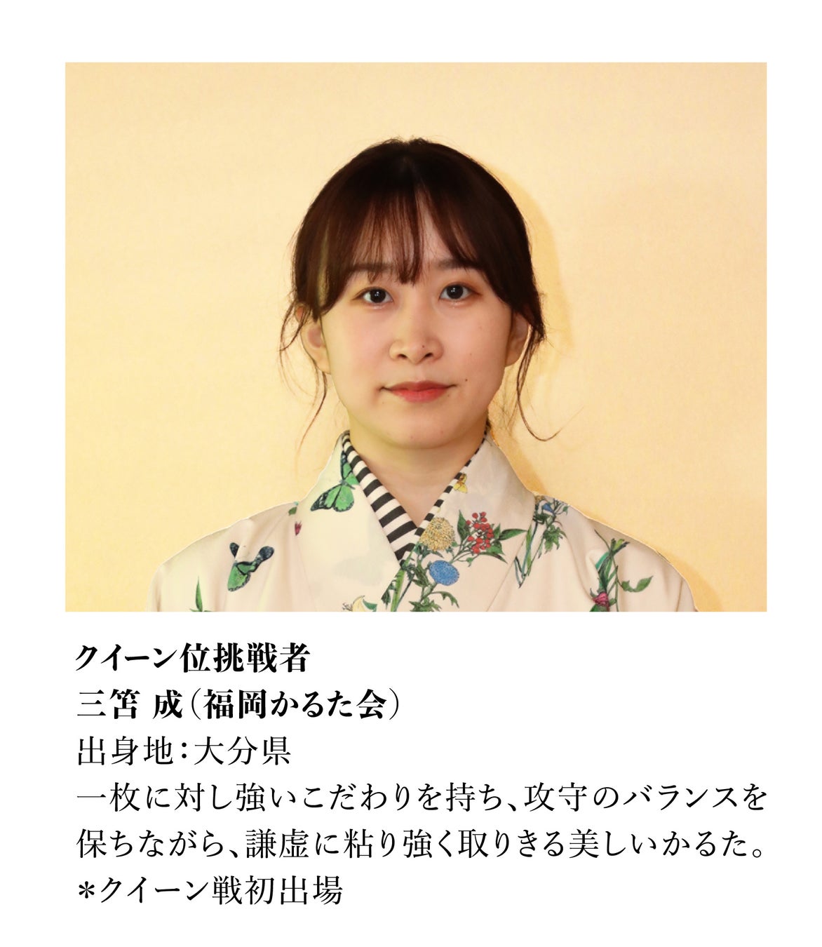 集中力の高さと安定した取りで3期目のクイーン位獲得を目指す山添クイーンと、念願の挑戦権を獲得し勢いのある三笘挑戦者。両者の対戦成績は1勝1敗。競技かるたの最高峰を目指す大舞台を制するのは、経験か勢いか。凛々しくそして美しい競技かるたの世界を是非会場でご覧ください。