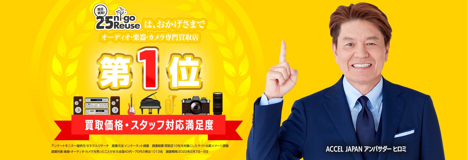 アンドトランク株式会社(本社:北海道札幌市、代表取締役社長:木原将平、以下「アンドトランク」(https://www.andtrunk.com/))が展開している買取事業ブランド「オーディオ・楽器・カメラ専門買取店ニーゴ・リユース(以下、ニーゴ・リユース)」にて、株式会社ブランジスタエールが運営する「成長企業と新しい日本をつくる。ACCEL JAPAN」アンバサダーのヒロミさんの肖像を活用したプロモーション活動を開始致します。